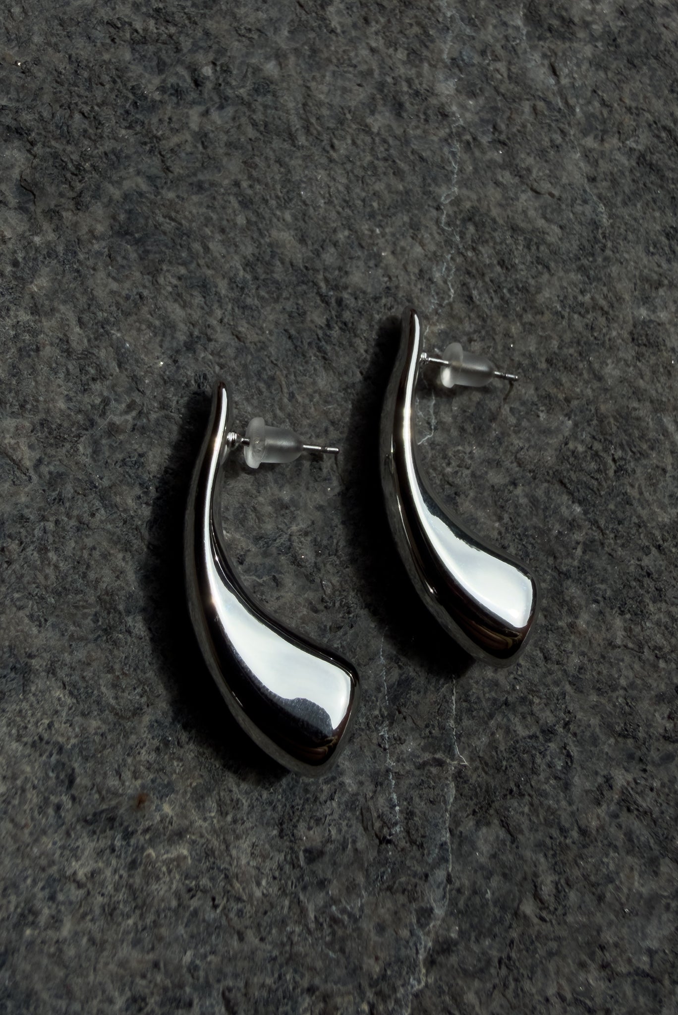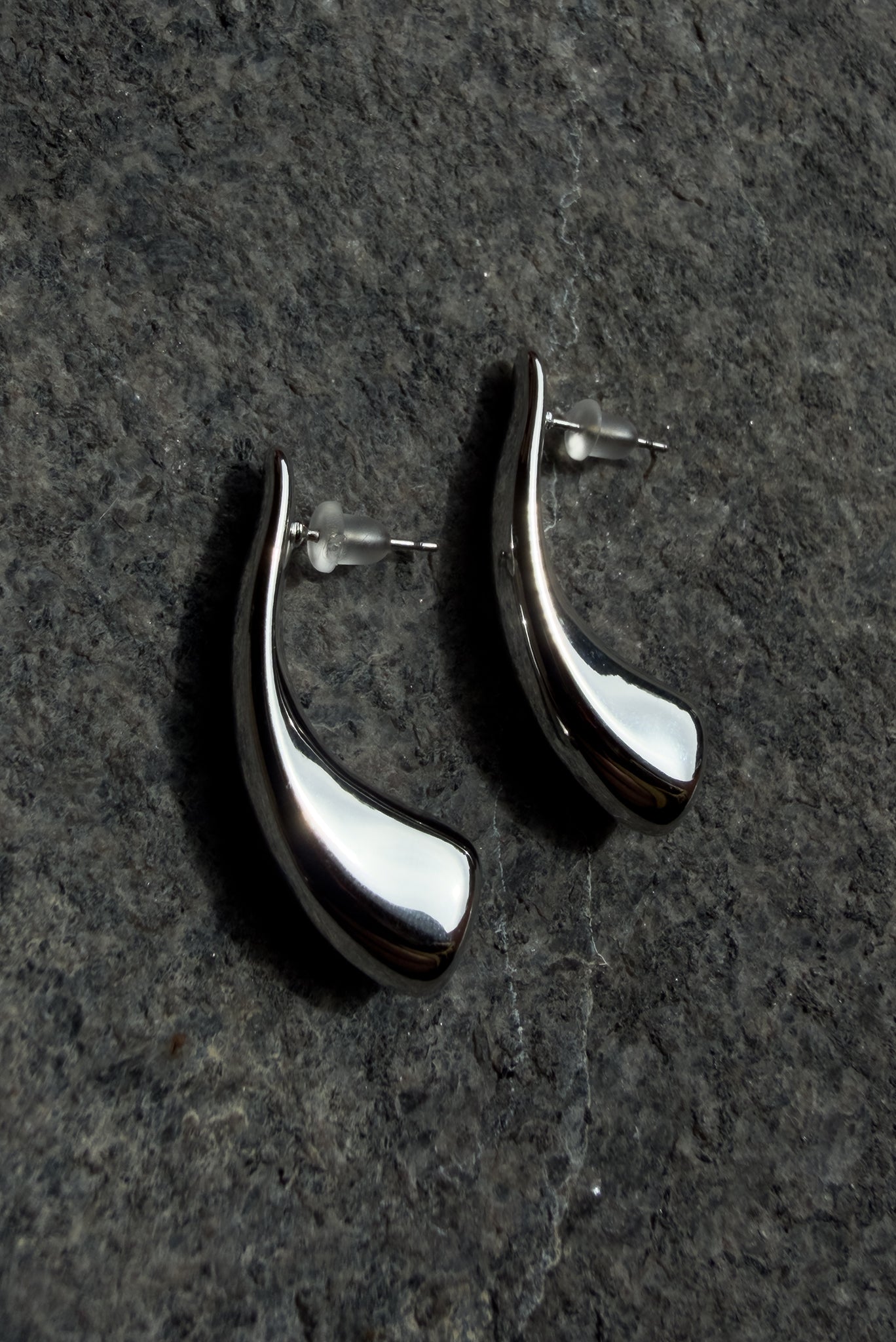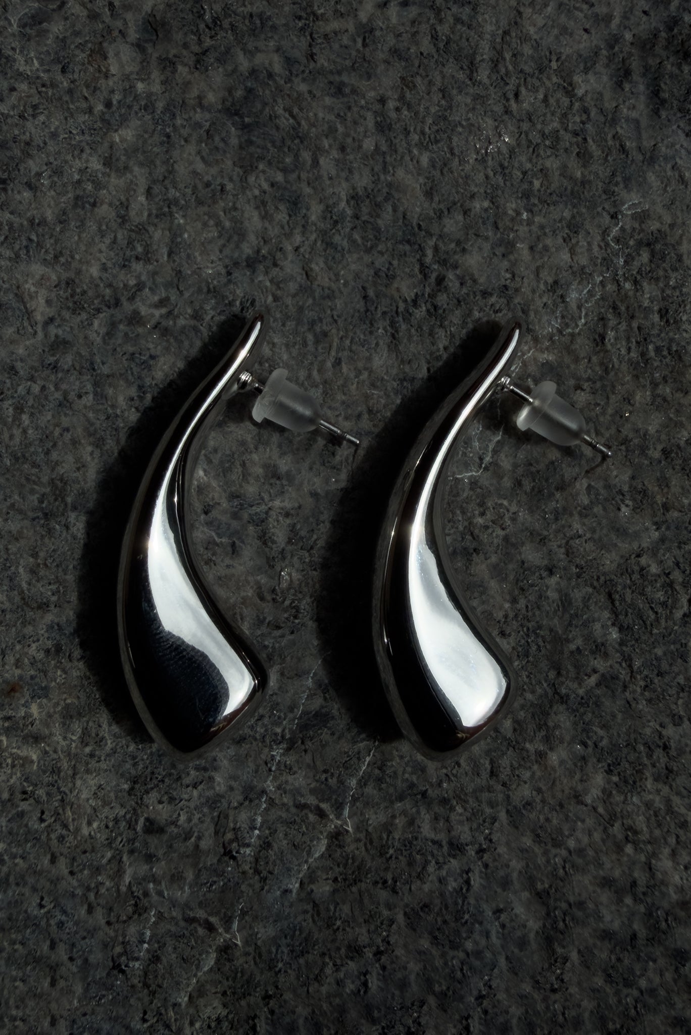 Sculptural silver hoops with a smooth, fluid silhouette. Minimalist yet bold, designed to add a sleek modern finish to any look.