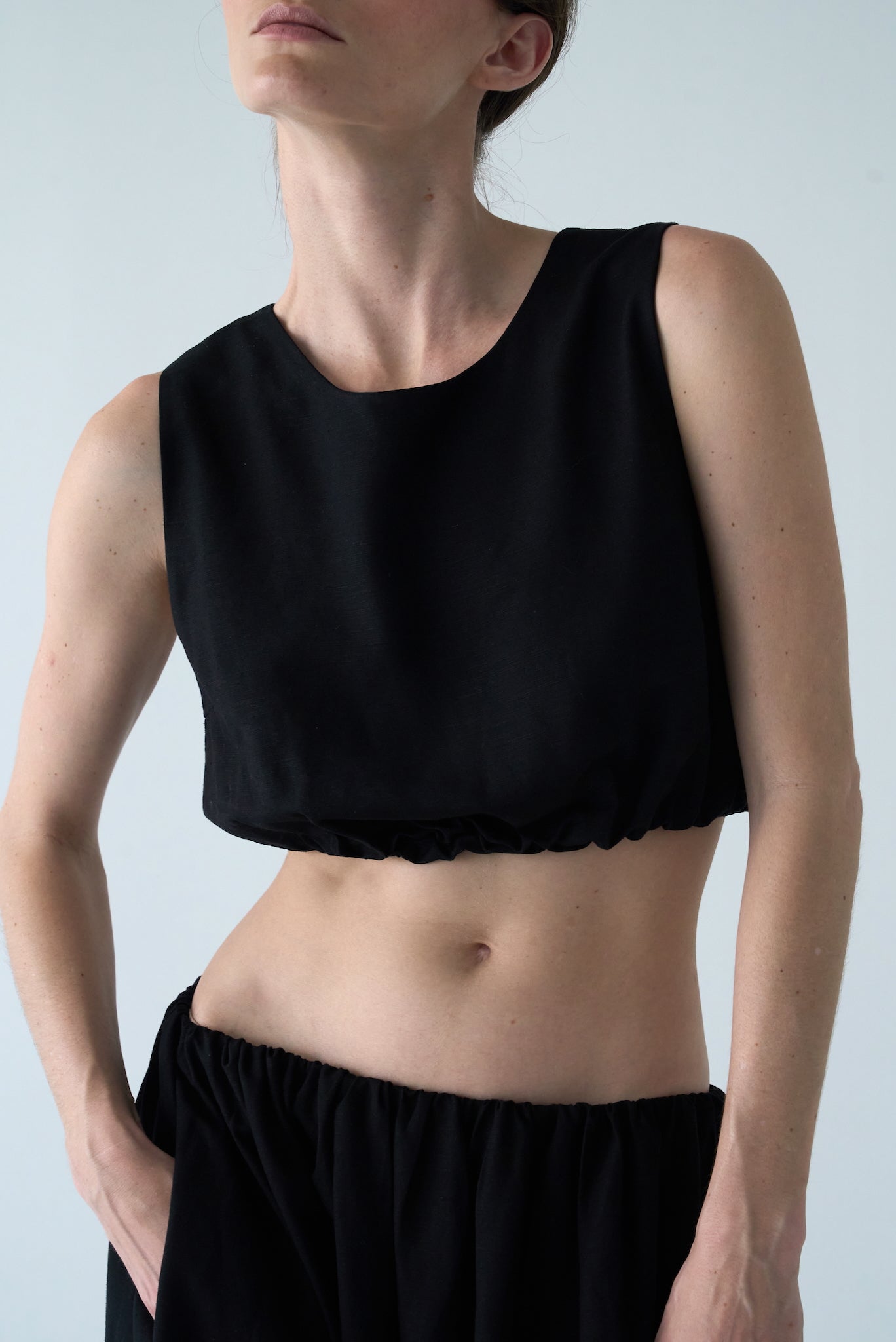 Gathered hem crop top in black linen. Slit and button closure at the back. Pairs best with matching gathered waist maxi skirt as a set.