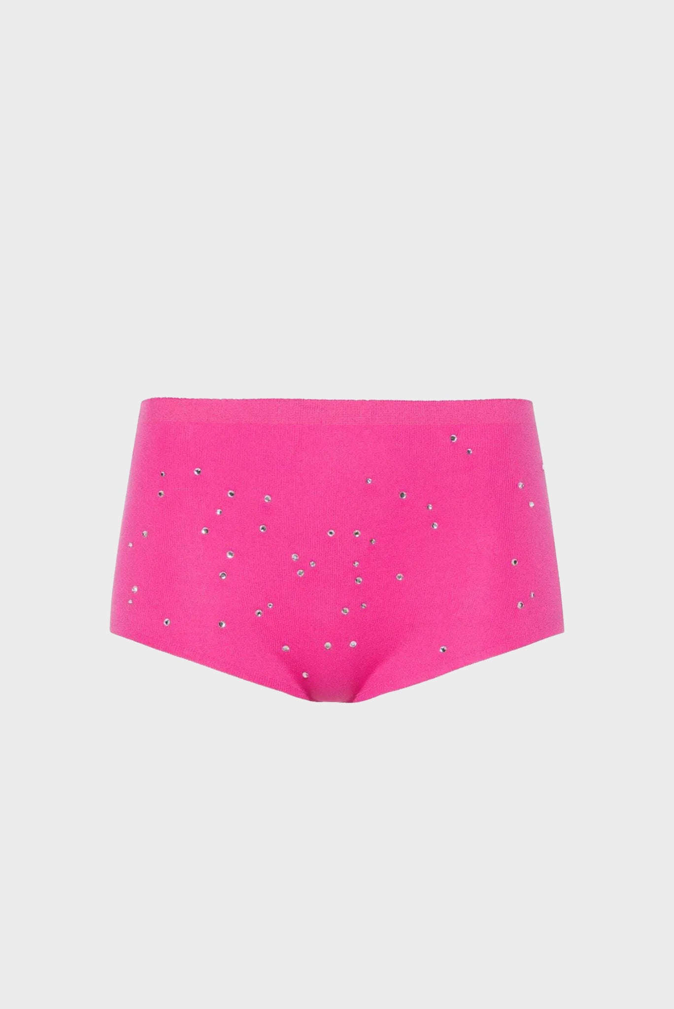 High-waisted knit shorts in vibrant fuchsia. Designed for a flattering silhouette with a soft stretch fit and embellished throughout with hand-applied rhinestones for a subtle shimmer. Wear them as a statement base layer or styled solo for a playful take on everyday loungewear.