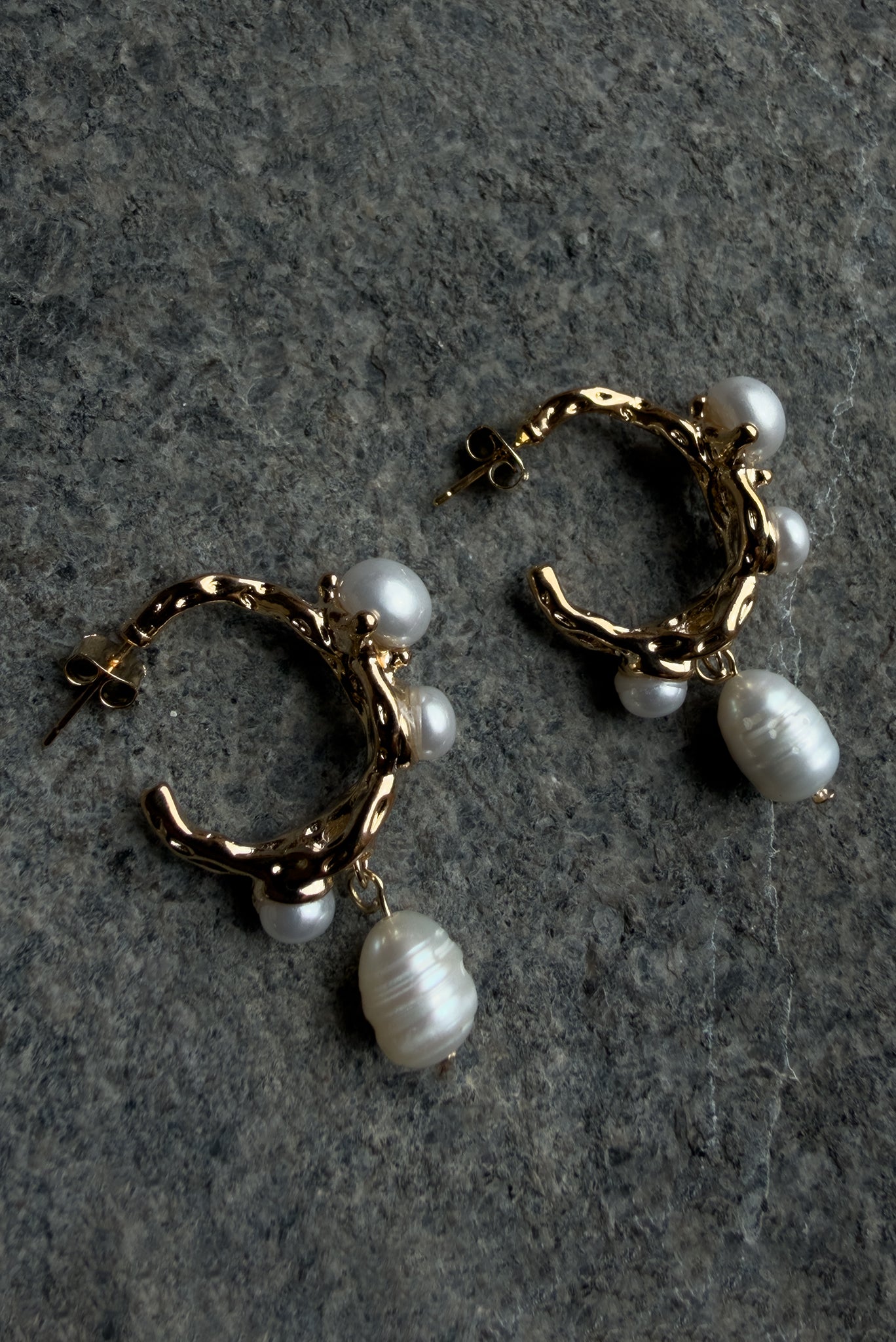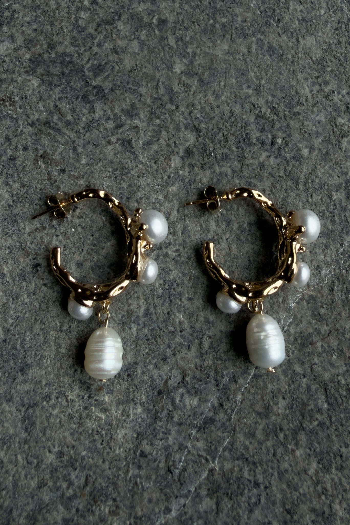 Textured gold hoops with branch-like detailing, finished with faux baroque pearls. A refined blend of organic inspiration and sculptural design.