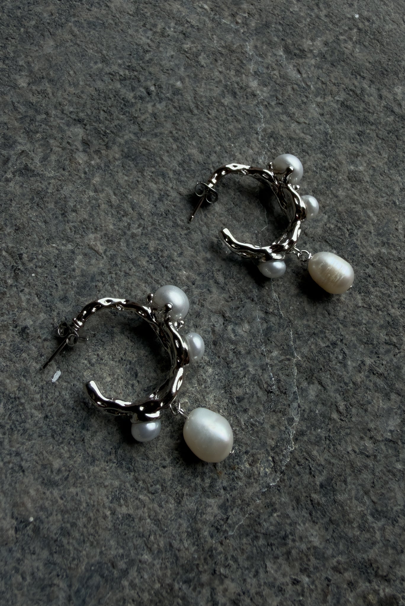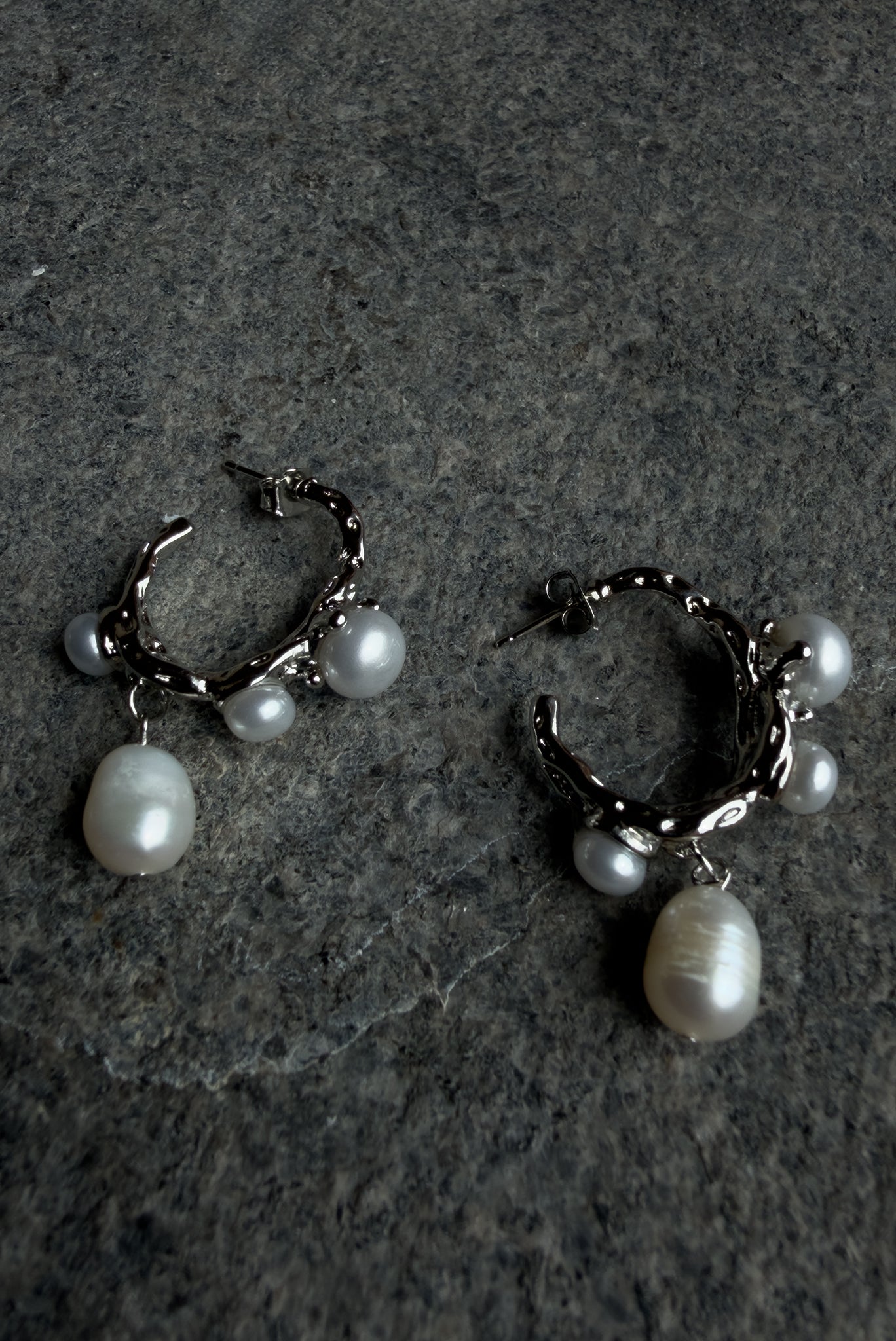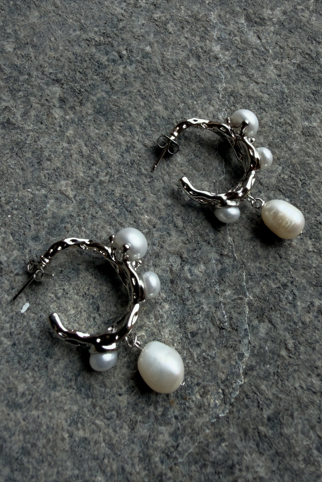 Textured silver hoops with branch-like detailing, finished with faux baroque pearls. A refined blend of organic inspiration and sculptural design.