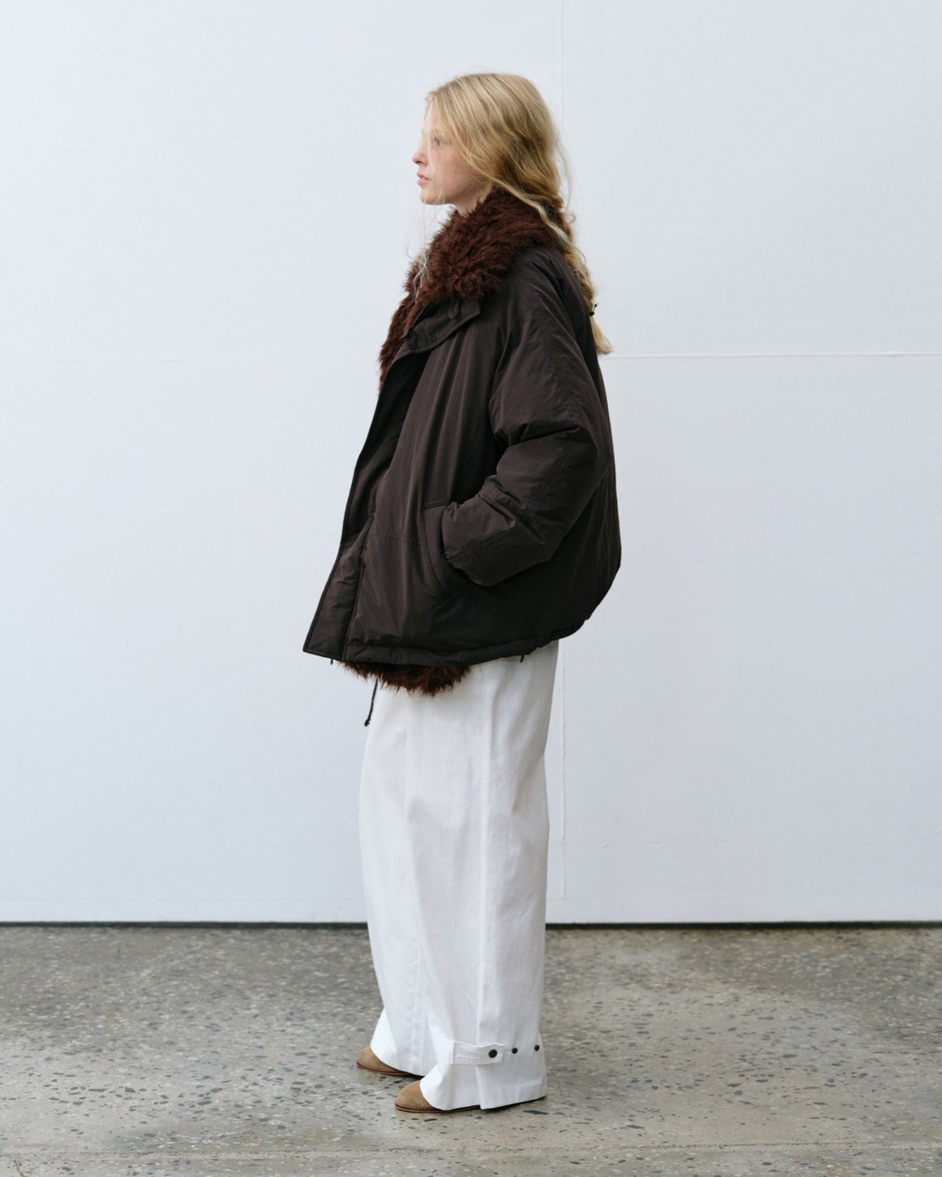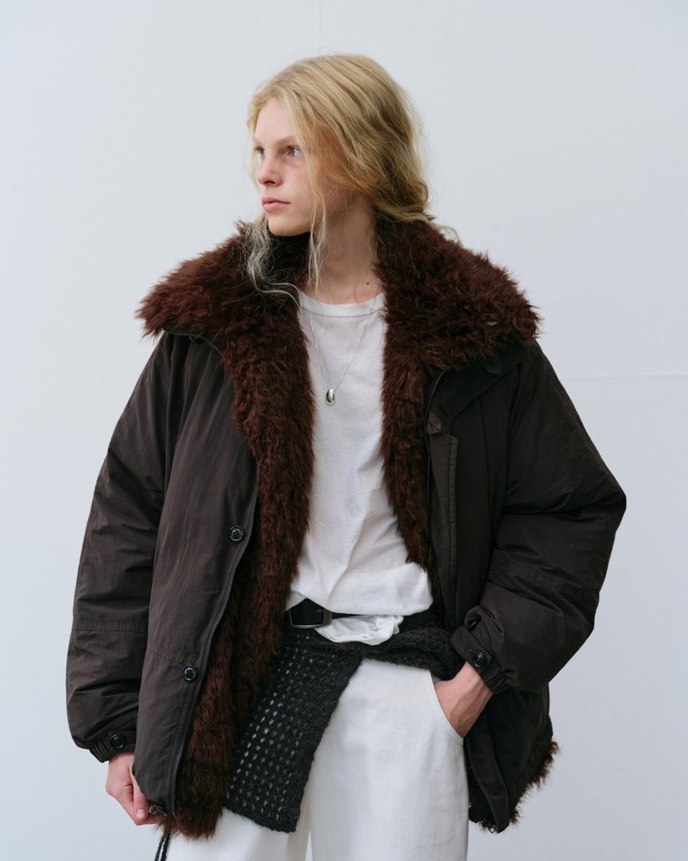 A directional update to the classic puffer. Designed with an oversized silhouette, dropped shoulders, and a voluminous body that cinches subtly at the hem. Finished with a plush brown shearling collar for a touch of warmth and contrast. Effortlessly cool layered over tailoring or denim.