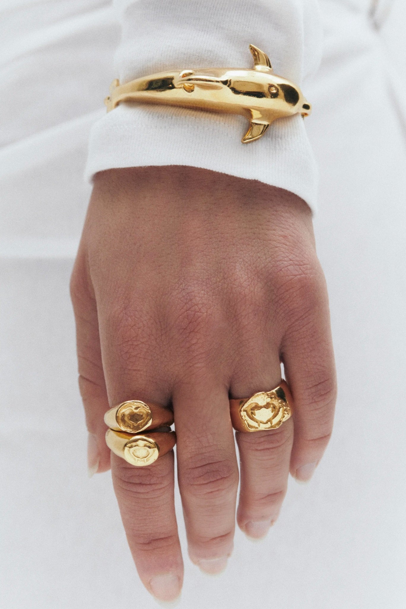 Gold-tone statement bracelet with a clean, sculptural feel featuring two dolphins. Handmade in gold plated recycled 925 sterling silver.