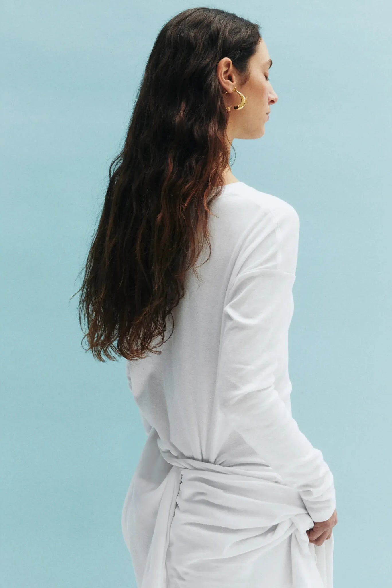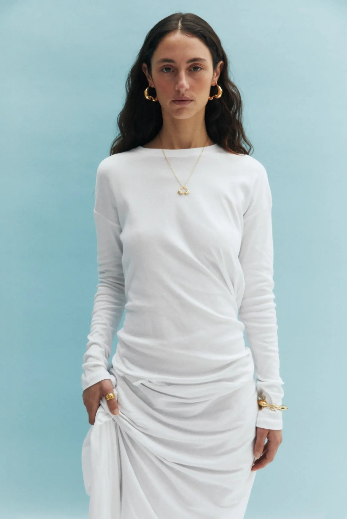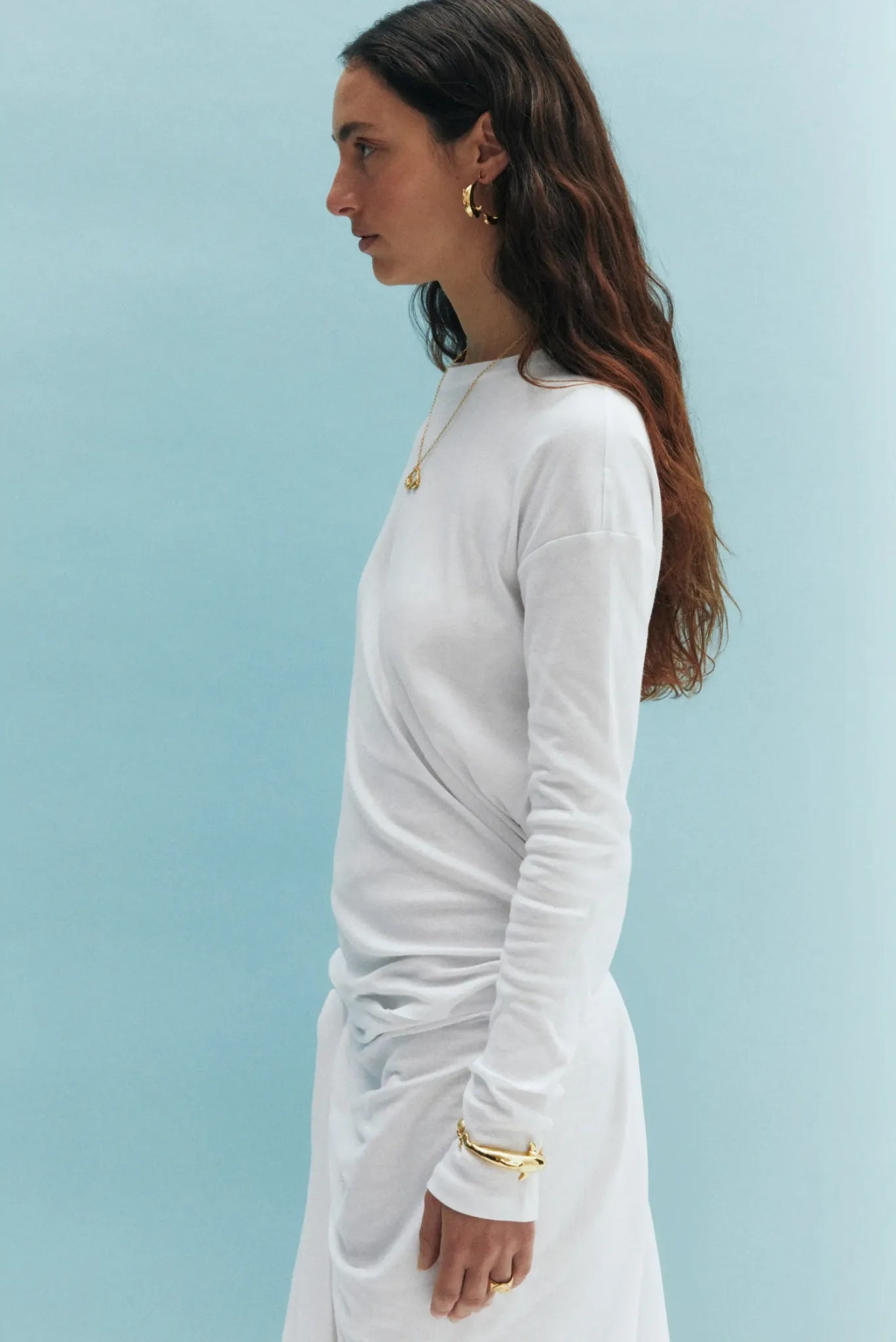Gold-tone hoop earrings with a bold, rounded silhouette featuring two dolphins. Handmade in gold plated, recycled 925 sterling silver.
