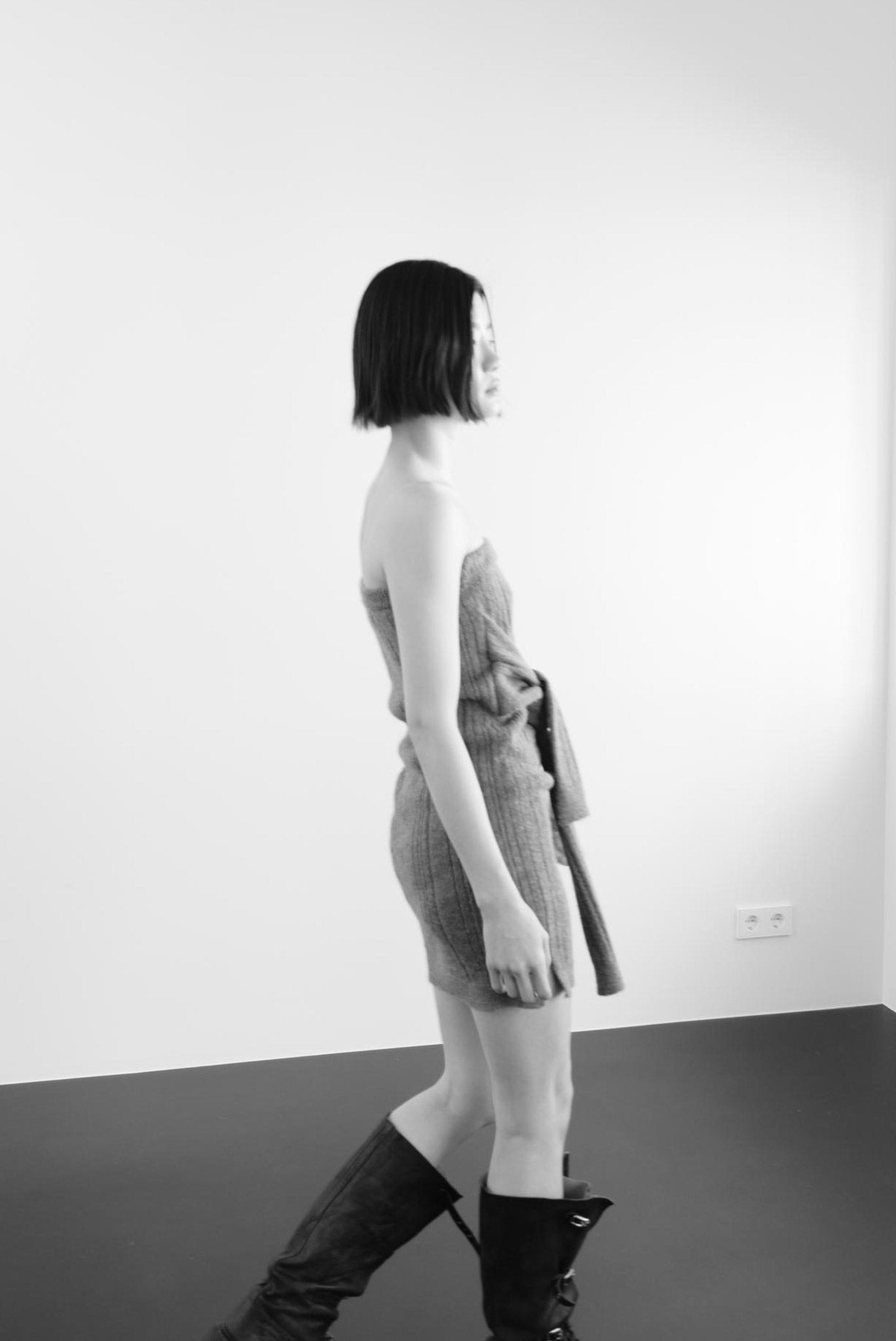 Alpaca blend knit long sleeve sweater best paired with the matching sleeve tie tube skirt.
