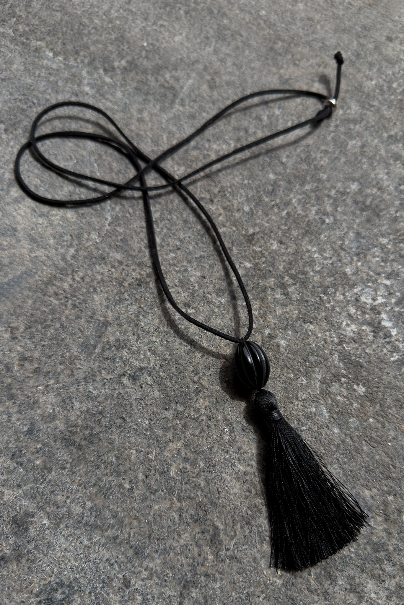 A bold black pendant necklace finished with a dramatic tassel. Graphic and modern—crafted to add movement and edge to any look.