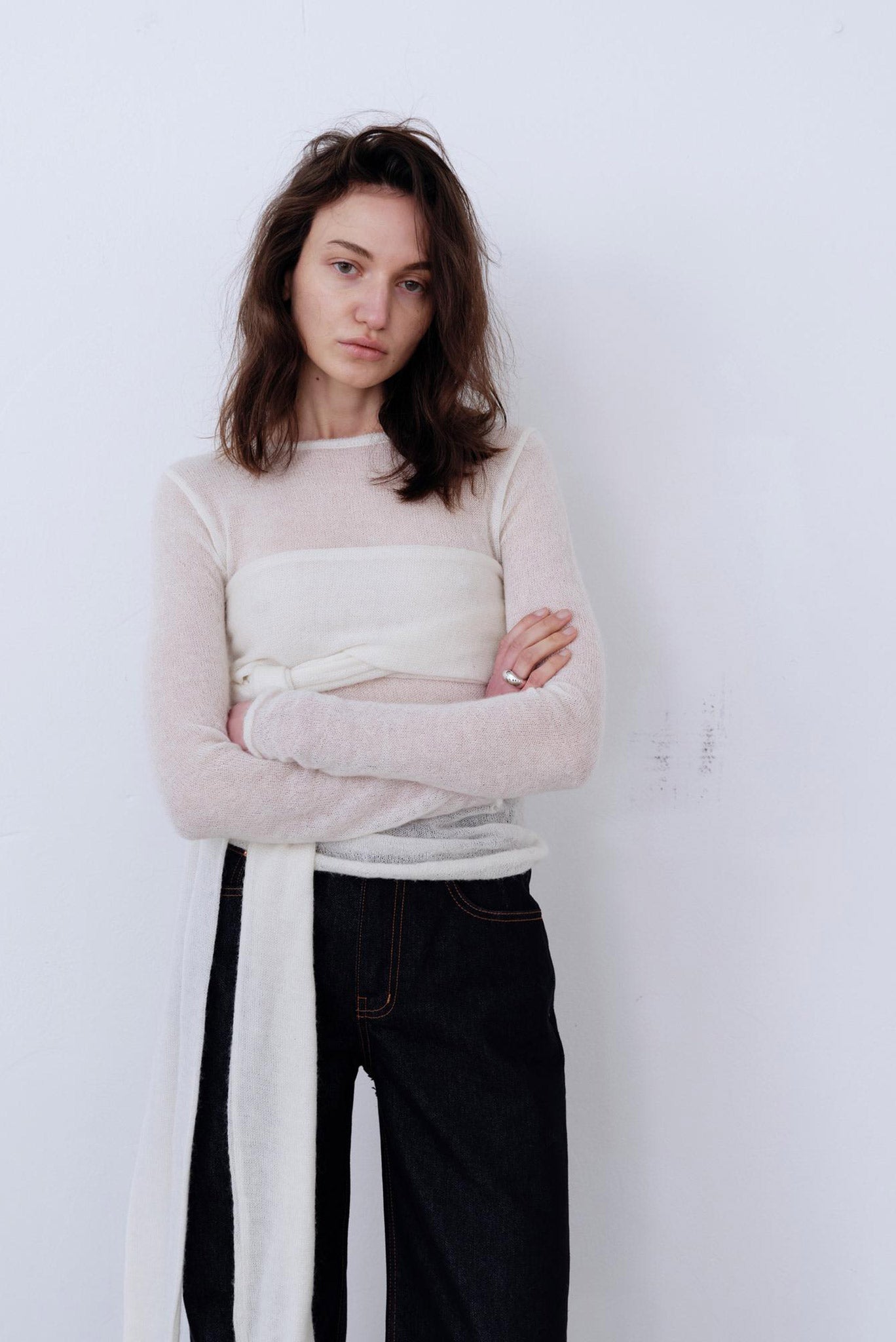 Thin semi-sheer sweater with scarf overlay that can be worn at the neck or wrapped around the chest.