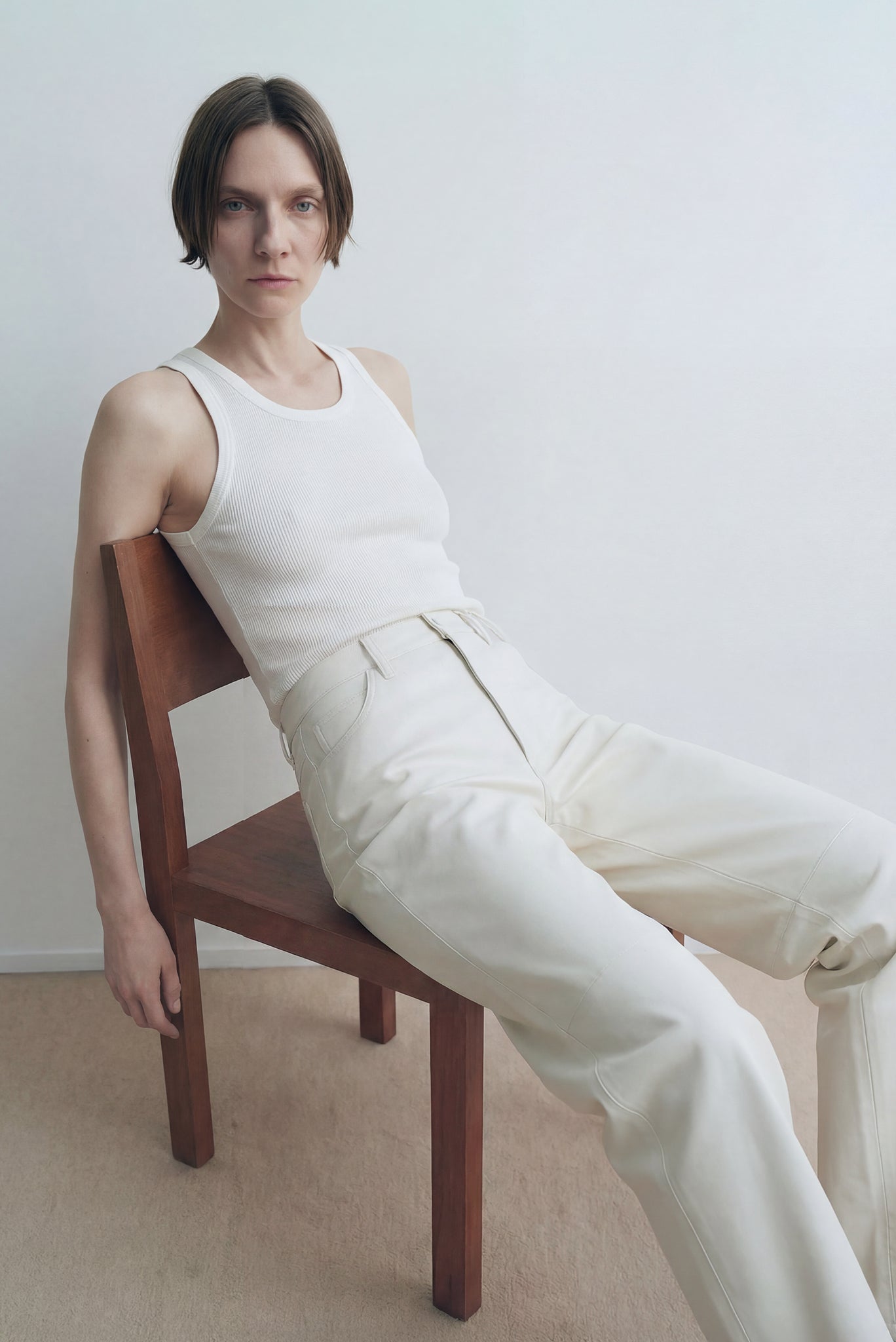 High-waisted faux leather pants with thick white top stitching details. Pants feature a button closure at the center front, two front pockets and two back pockets.
