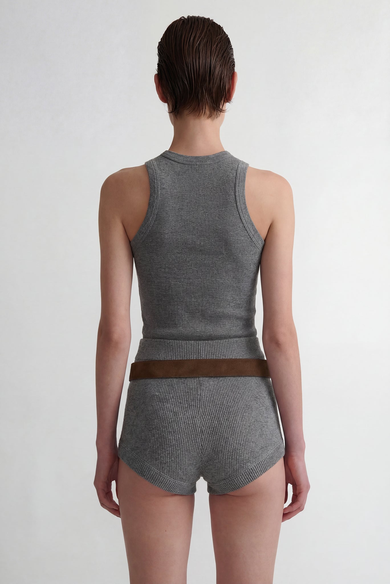High-rise brief-style short constructed in a soft, medium-weight ribbed knit. Designed with a smooth elasticated waistband and contoured seam lines that follow the natural curve of the body. Features a full-coverage silhouette with gently curved leg openings and subtle rib trim for structure and comfort. Finished with clean stitching throughout and a soft interior handfeel.