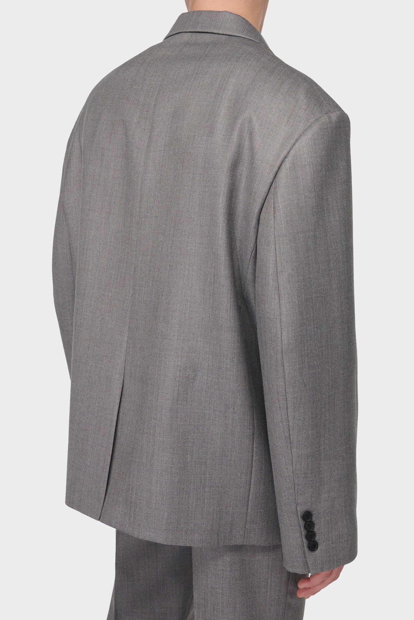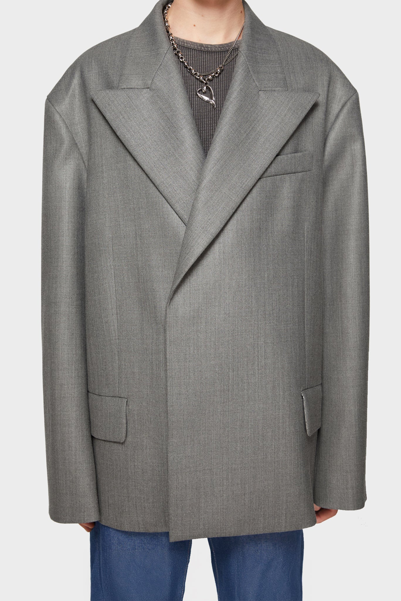 A sharply tailored yet effortlessly relaxed silhouette, this Acne Studios oversized blazer is a closet staple. Crafted from a lightweight wool blend in cool grey, it features exaggerated peak lapels, a concealed double-breasted closure, and structured shoulders that create a sculptural drape. The oversized fit lends a directional, genderless attitude — perfect layered over a fine knit or crisp shirt. Finished with front flap pockets, a chest welt pocket, and tonal lining for a seamless finish.