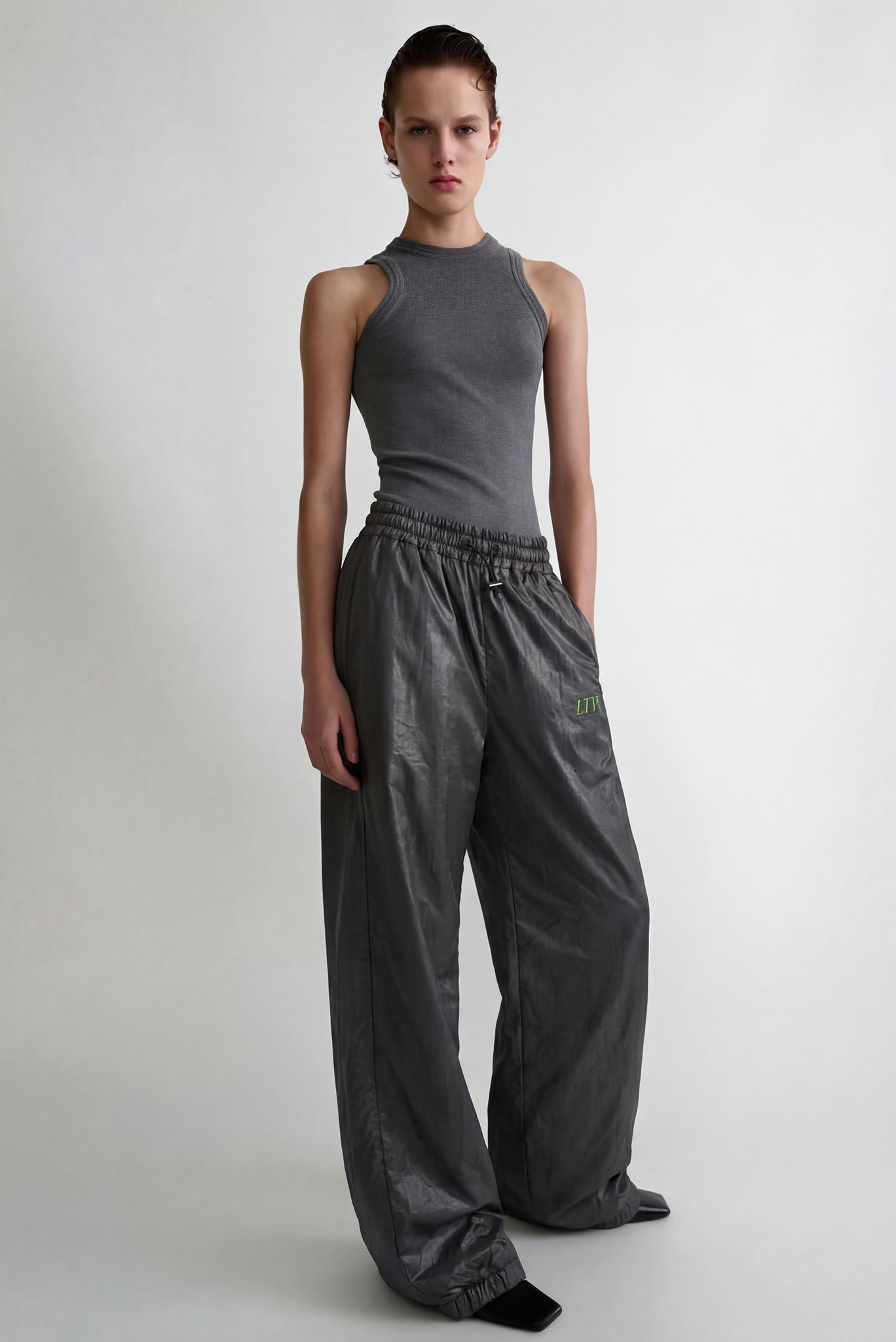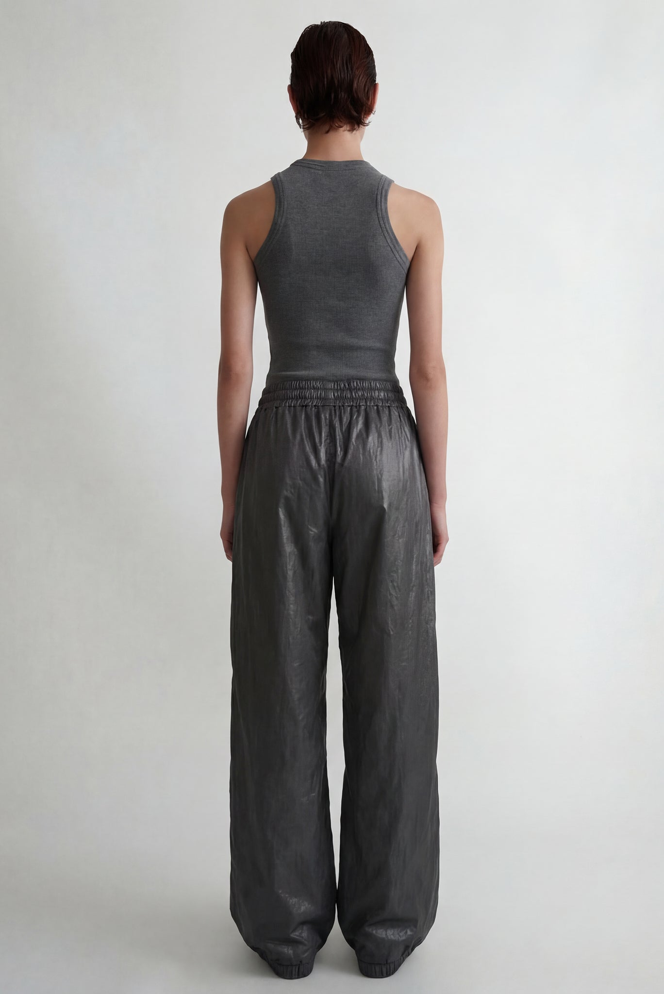 Relaxed-fit technical pant crafted from the same fleece lined, lightweight shell of the matching jacket with a soft sheen. Designed with an elasticated waistband and adjustable drawstring for comfort and ease. Features a straight-to-tapered leg with elasticated hems, creating a gathered finish at the ankle. Minimal detailing throughout, accented with a small contrast logo at the upper leg. Intended for effortless wear, balancing function and modern athleisure styling.