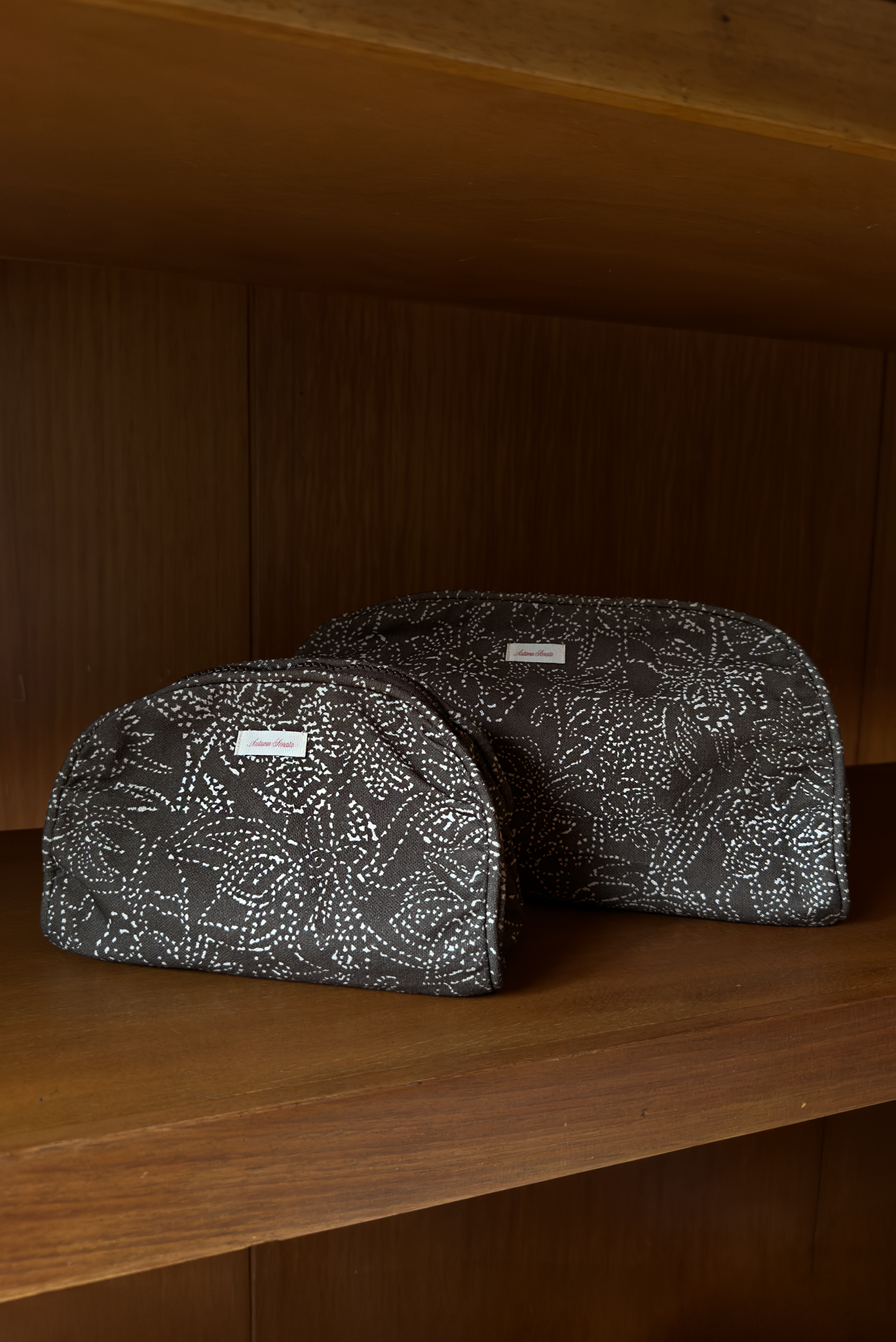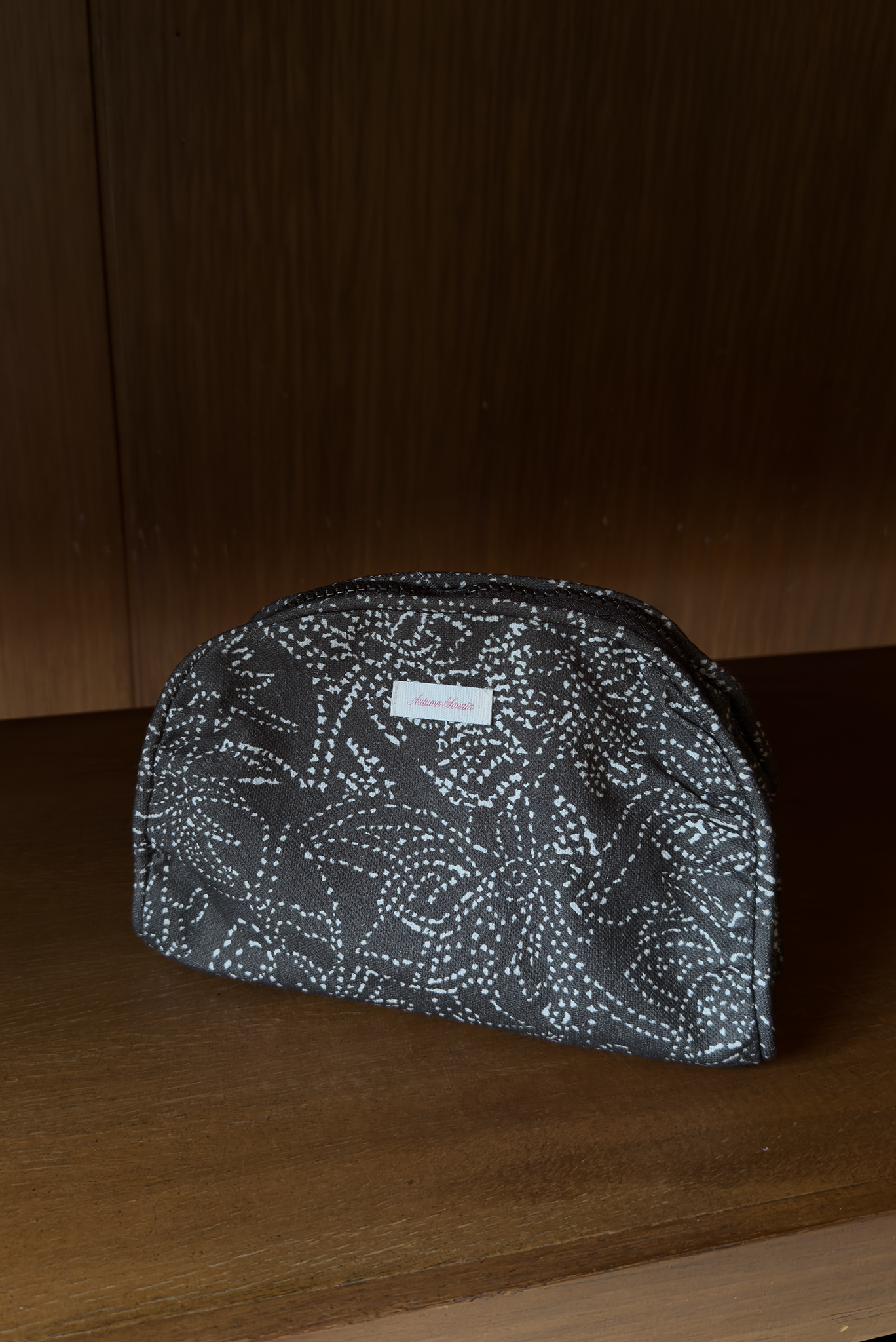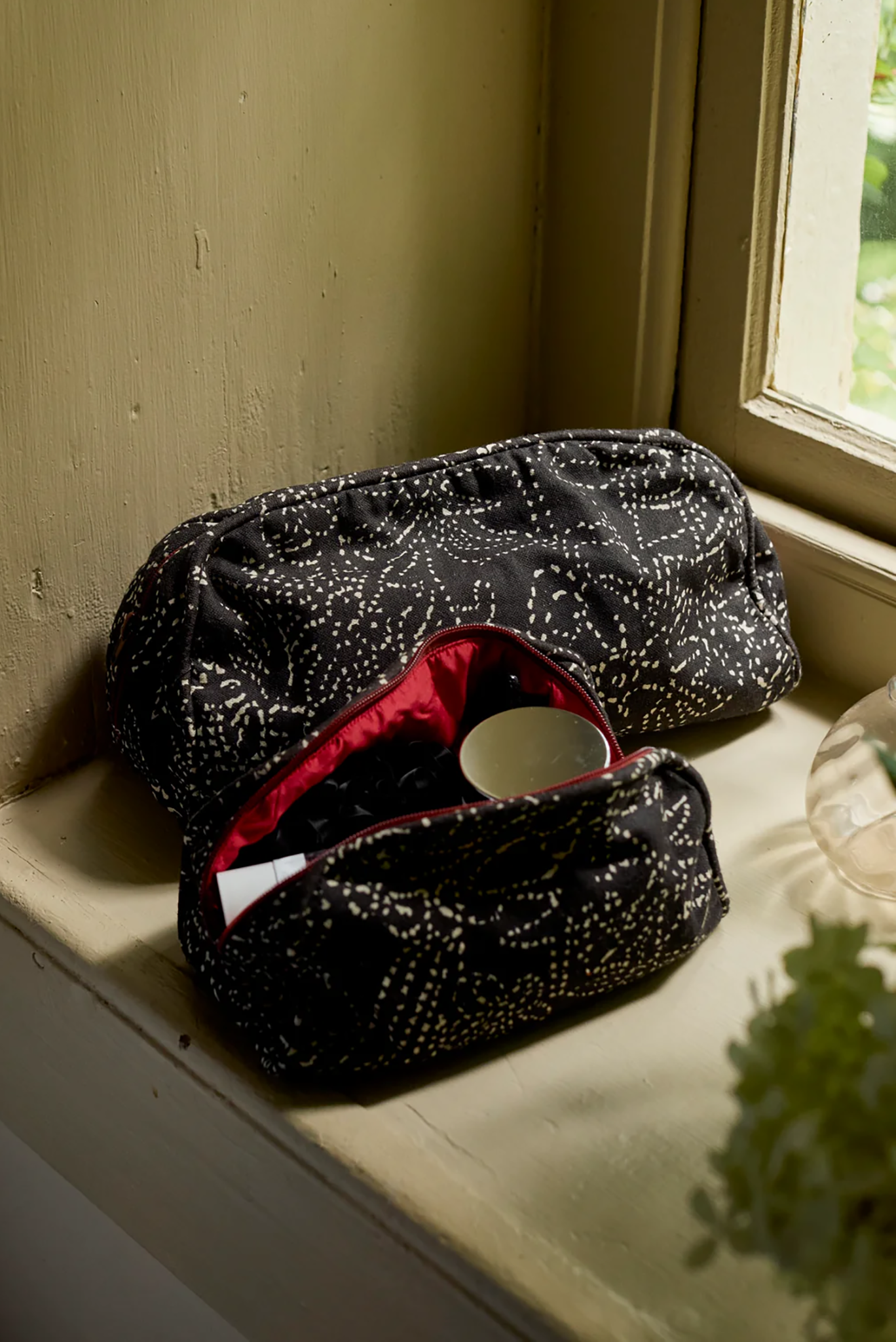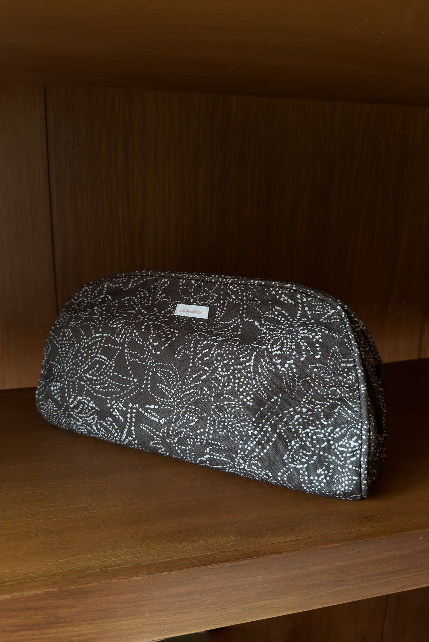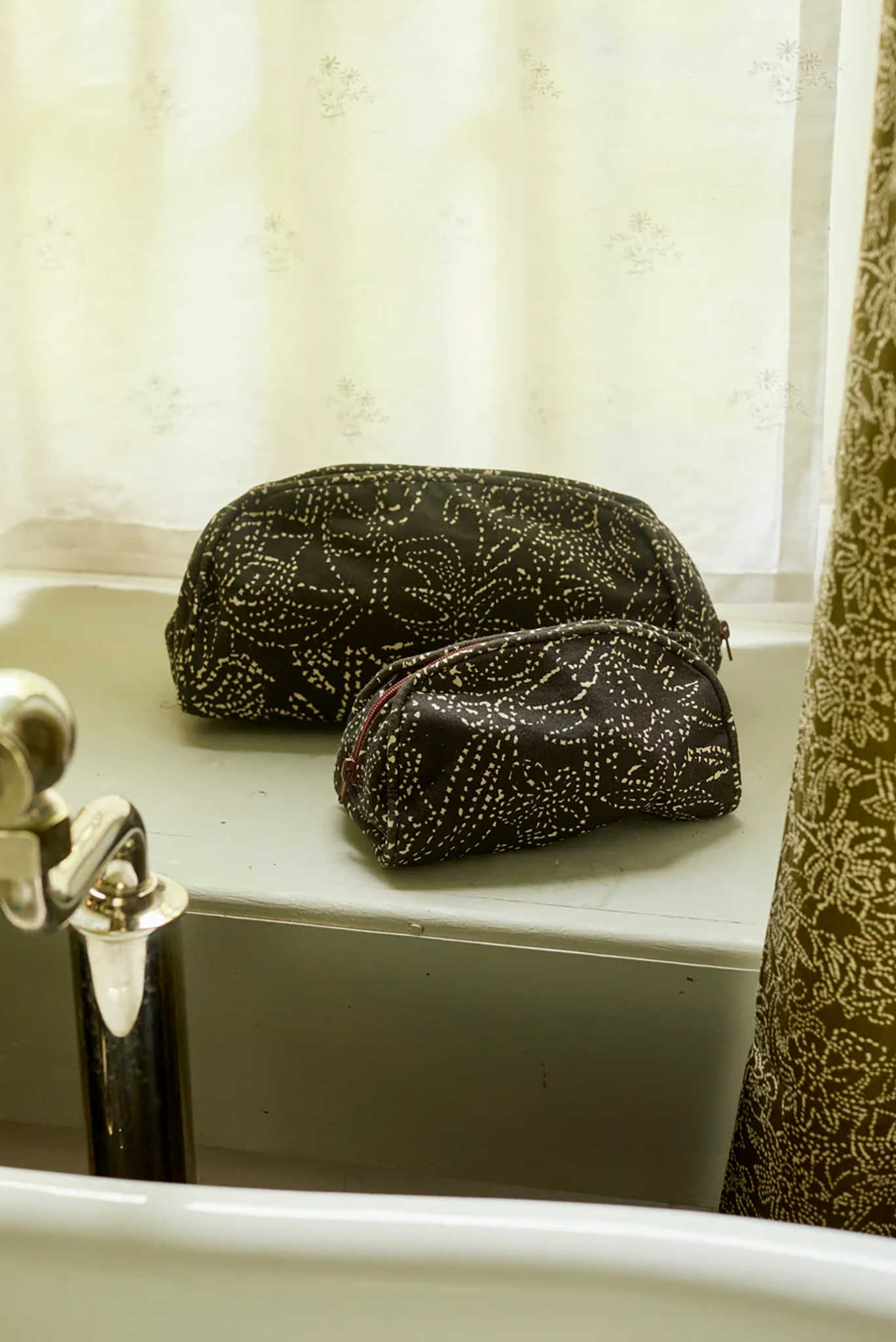 Florals and greenery are abstracted into a playground of contrasting, Pointillistic dots in this Walnut and Beige array that create a transformative, calming landscape. This piece is versatile and essential for travel and daily life on the go. The bag features a crimson water-repellent lining to store your most treasured makeup, toiletries, and potions.