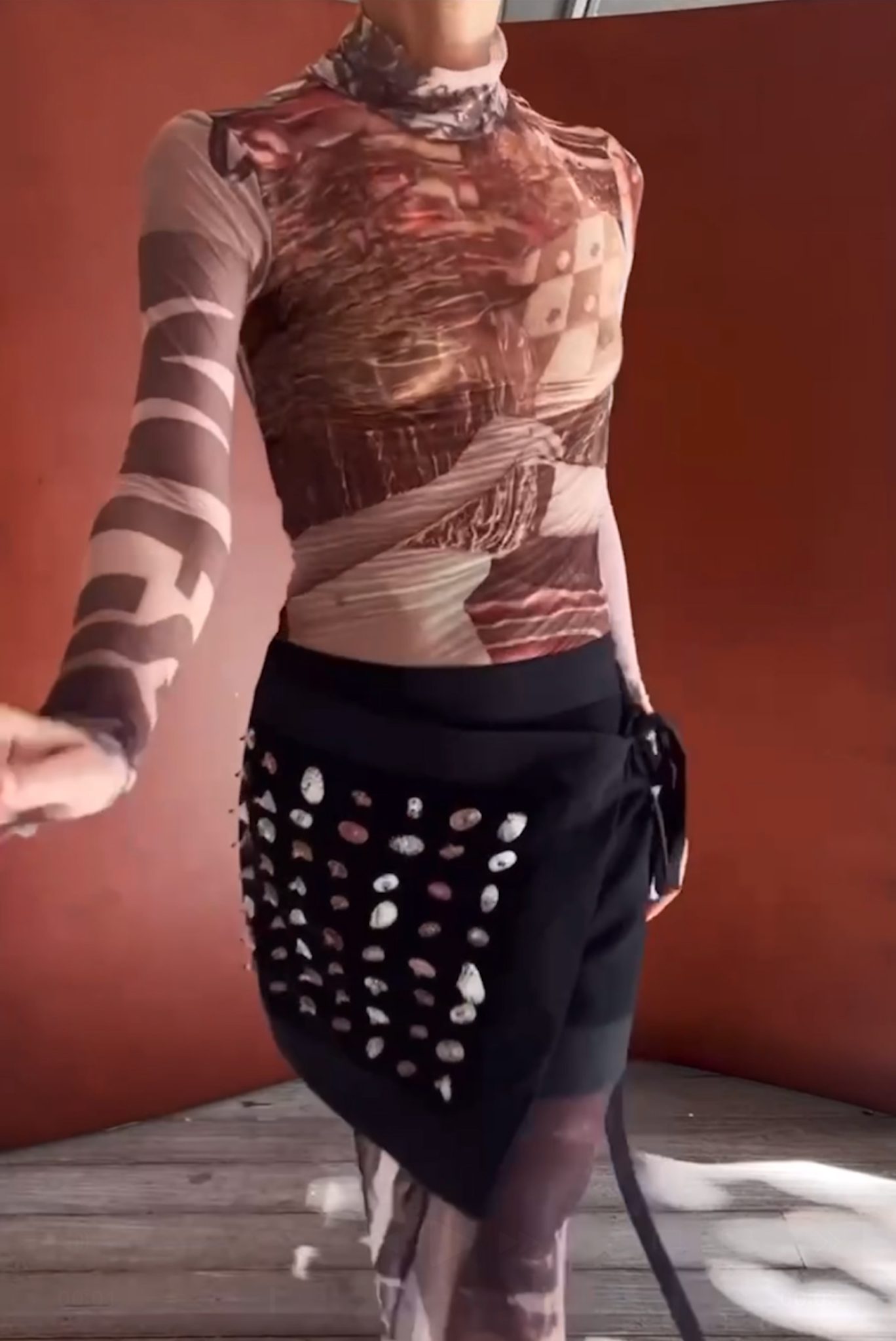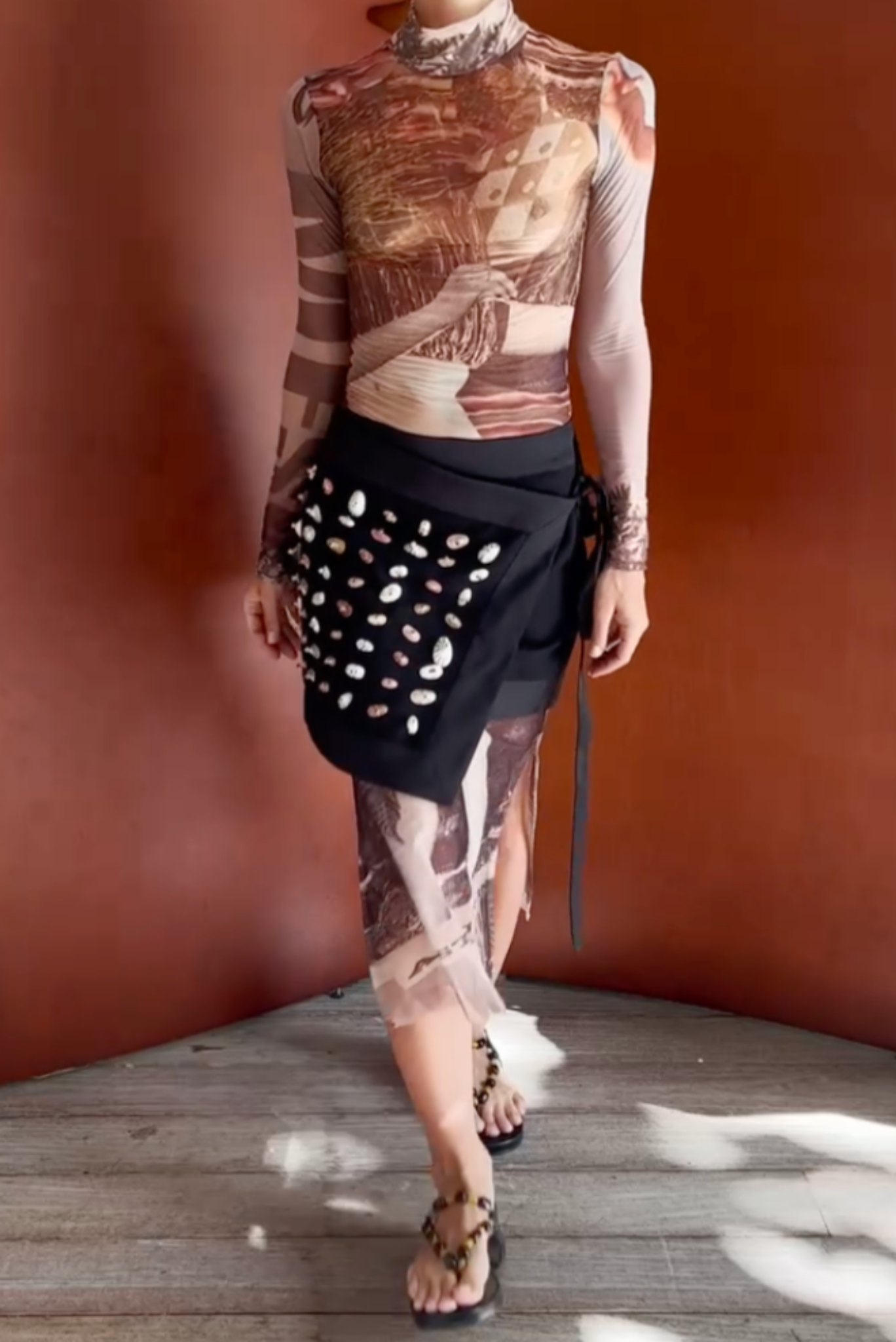 Long sleeve maxi dress with a fitted silhouette and a high neck for a sexy but elevated look. The collaged placement print is designed to wrap around the curves of the body and features a subtle colour palette infused with browns and pinks. Made from our new recycled polyester mesh.