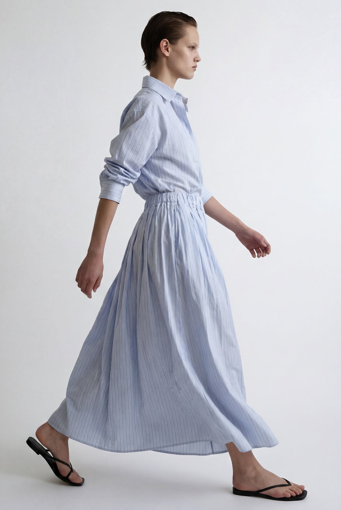 A voluminous midi skirt cut in the same striped cotton fabrication. Designed with an elasticated waistband for a comfortable pull-on fit, the skirt falls into soft gathers that create natural movement and fullness. The silhouette is airy and unstructured, balancing ease with a clean, everyday wearability.