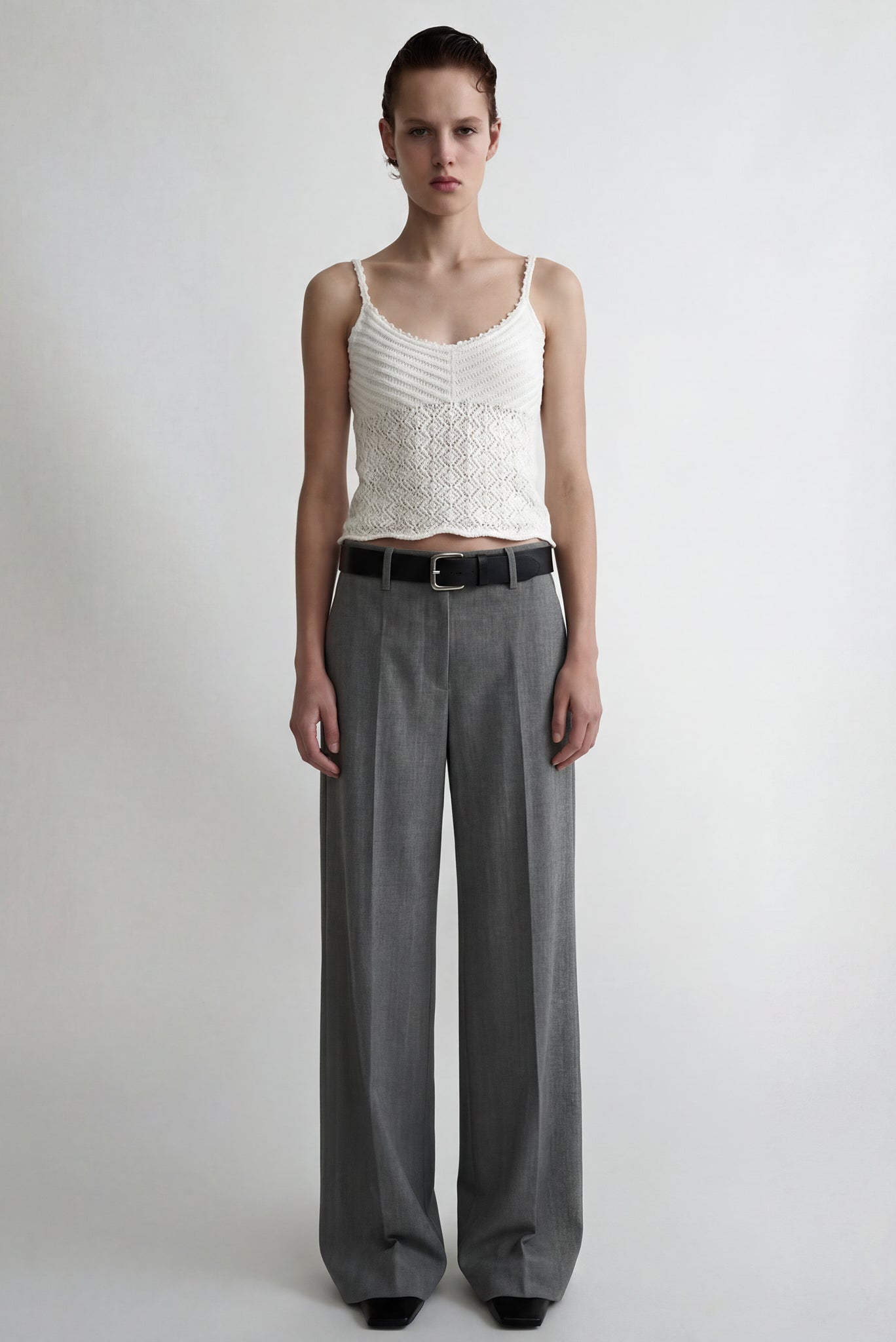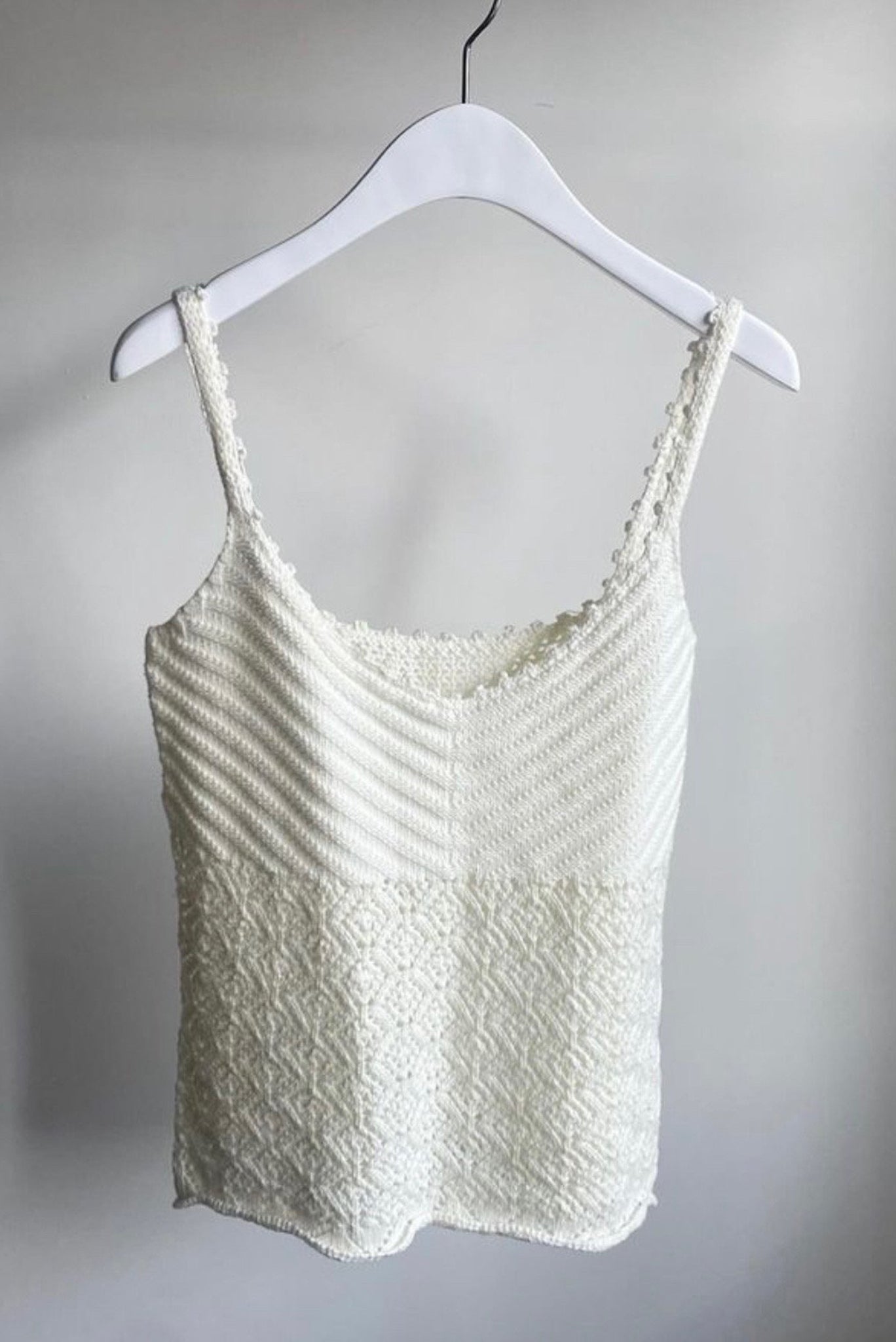 A delicate yet substantial hand-knit tank that balances softness with structure. Crafted in an ivory cotton blend, this piece features a textural stitch mix—a chevron-knit bodice that gently contours the chest, transitioning into a denser woven stitch through the body for subtle shape and depth.
