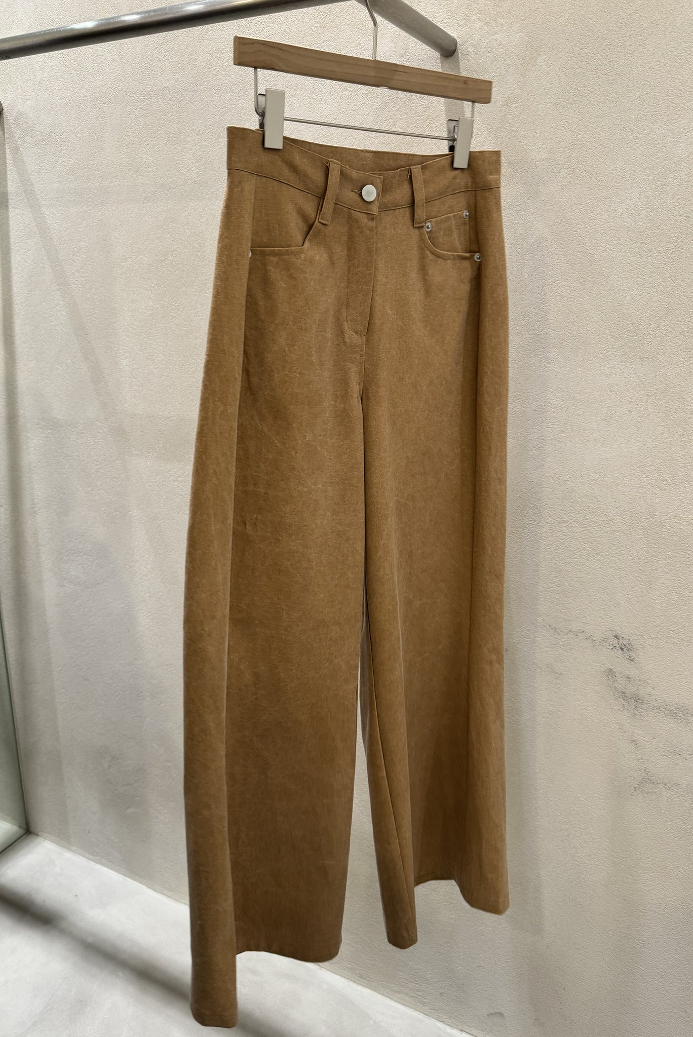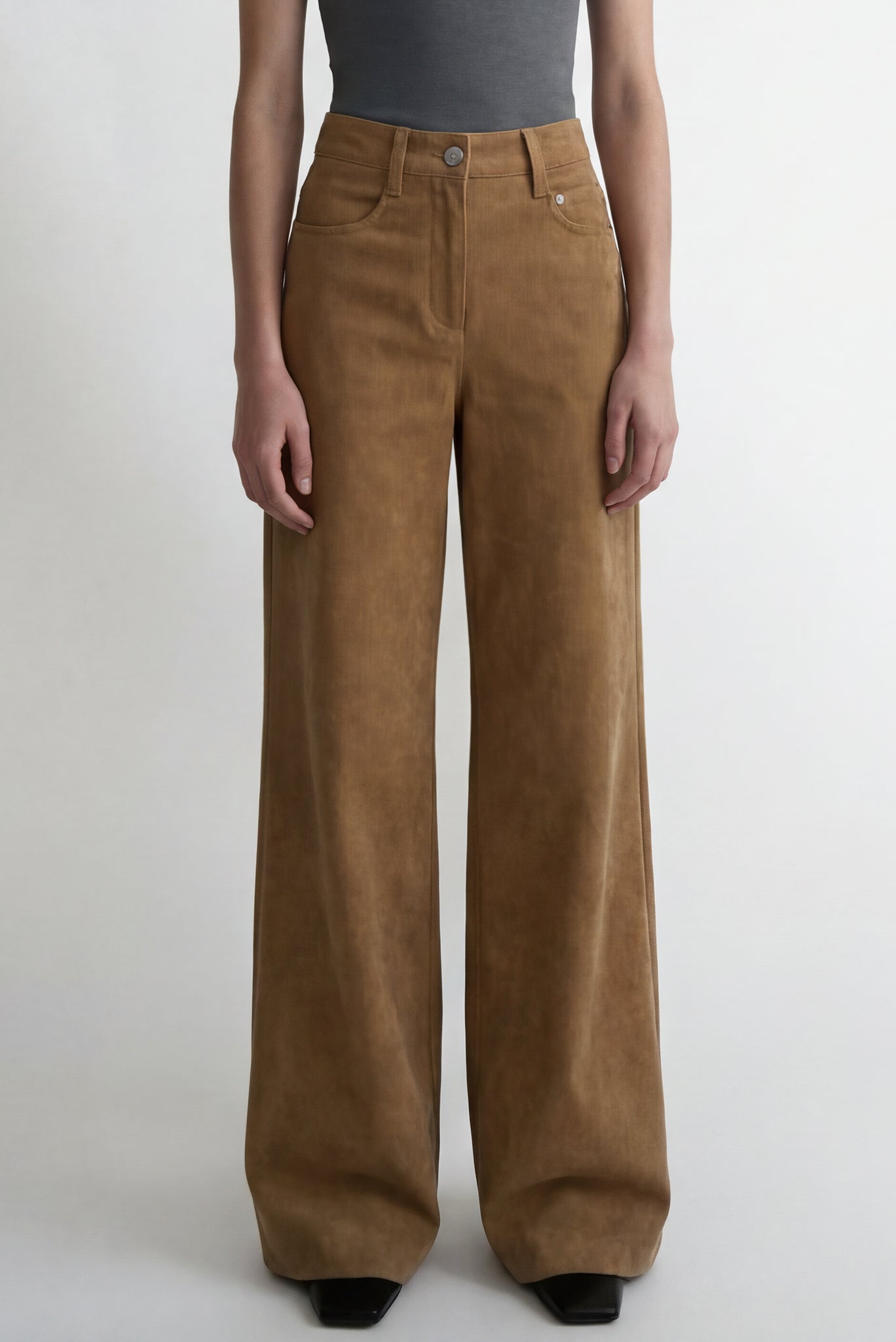 Designed with a high-rise waist and clean front closure for a refined, elongating silhouette. The leg falls straight into a wide cut, offering fluid movement and an elegant drape. Finished with classic five-pocket detailing and tonal stitching for a modern take on a timeless shape.
