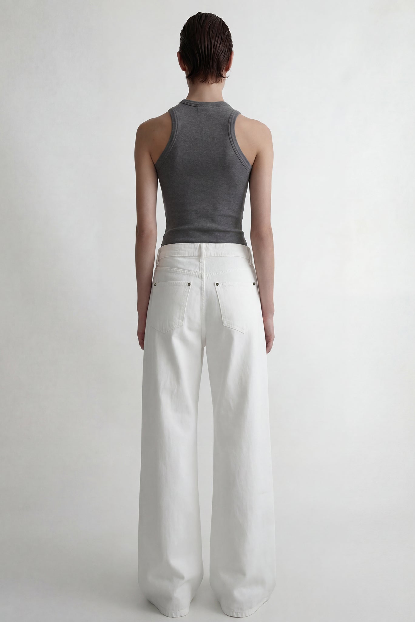 White denim trousers crafted from structured cotton denim with a clean, rigid hand feel. Designed with a mid-rise waist, straight leg silhouette, and full-length cut. Finished with classic five-pocket construction, belt loops, button closure, and subtle seam detailing through the leg. A minimal, everyday jean with a crisp, modern profile.