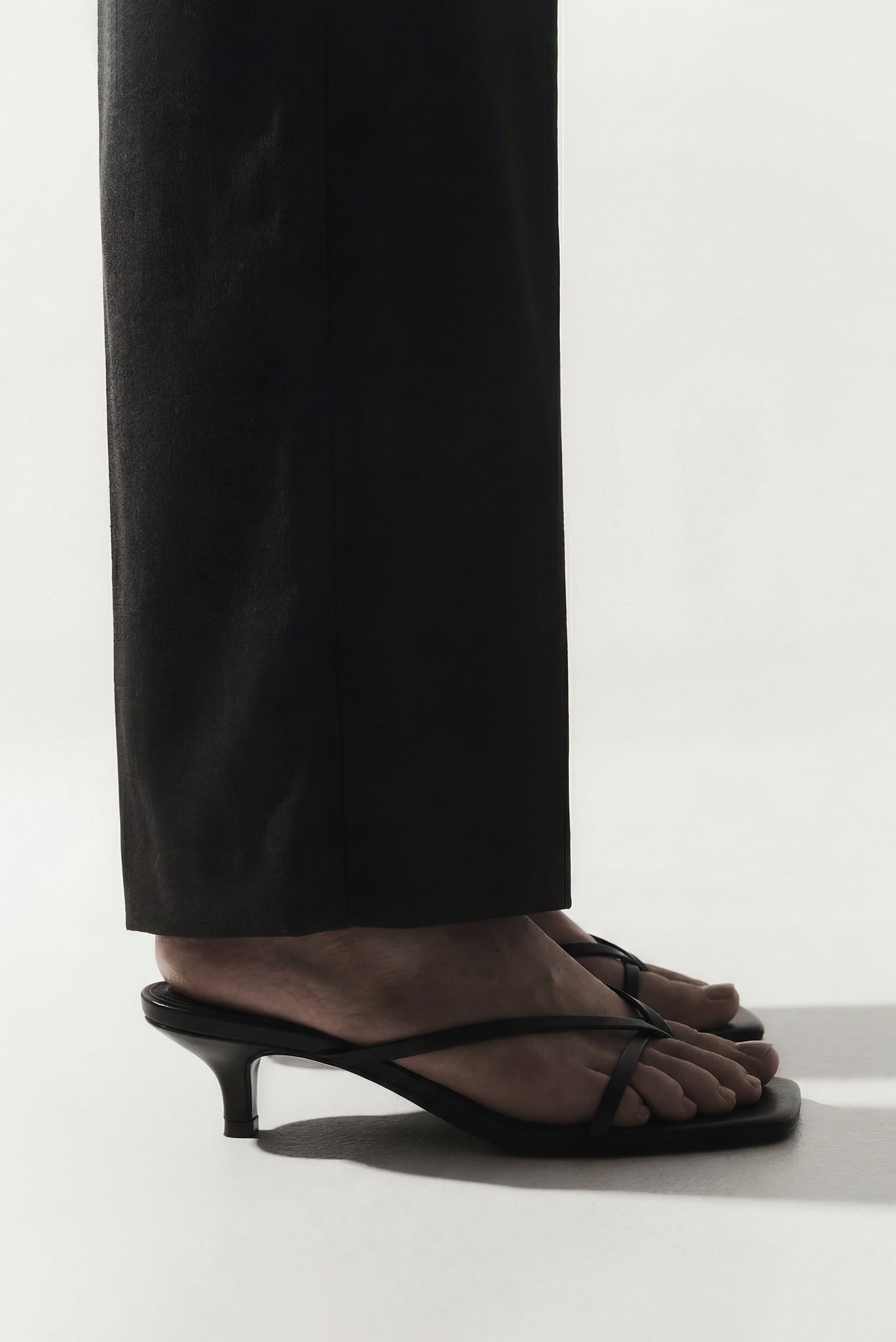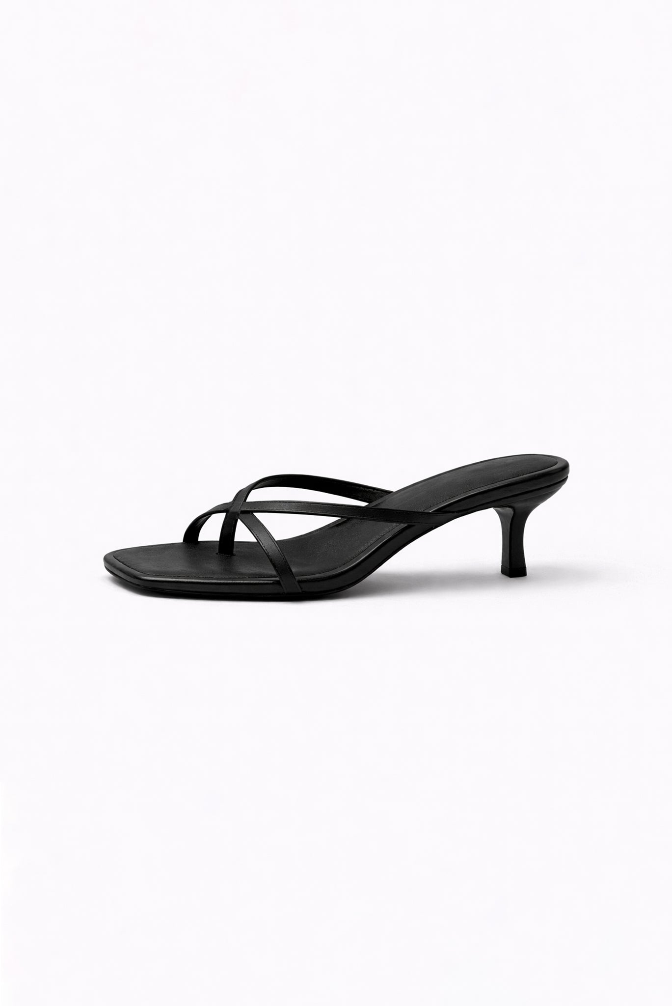 Smooth black faux leather square toe thong sandal with a slim horizontal strap placed beneath the thong strap for a clean, uninterrupted line across the foot. Designed with a low kitten heel that provides subtle lift while maintaining comfort and stability.