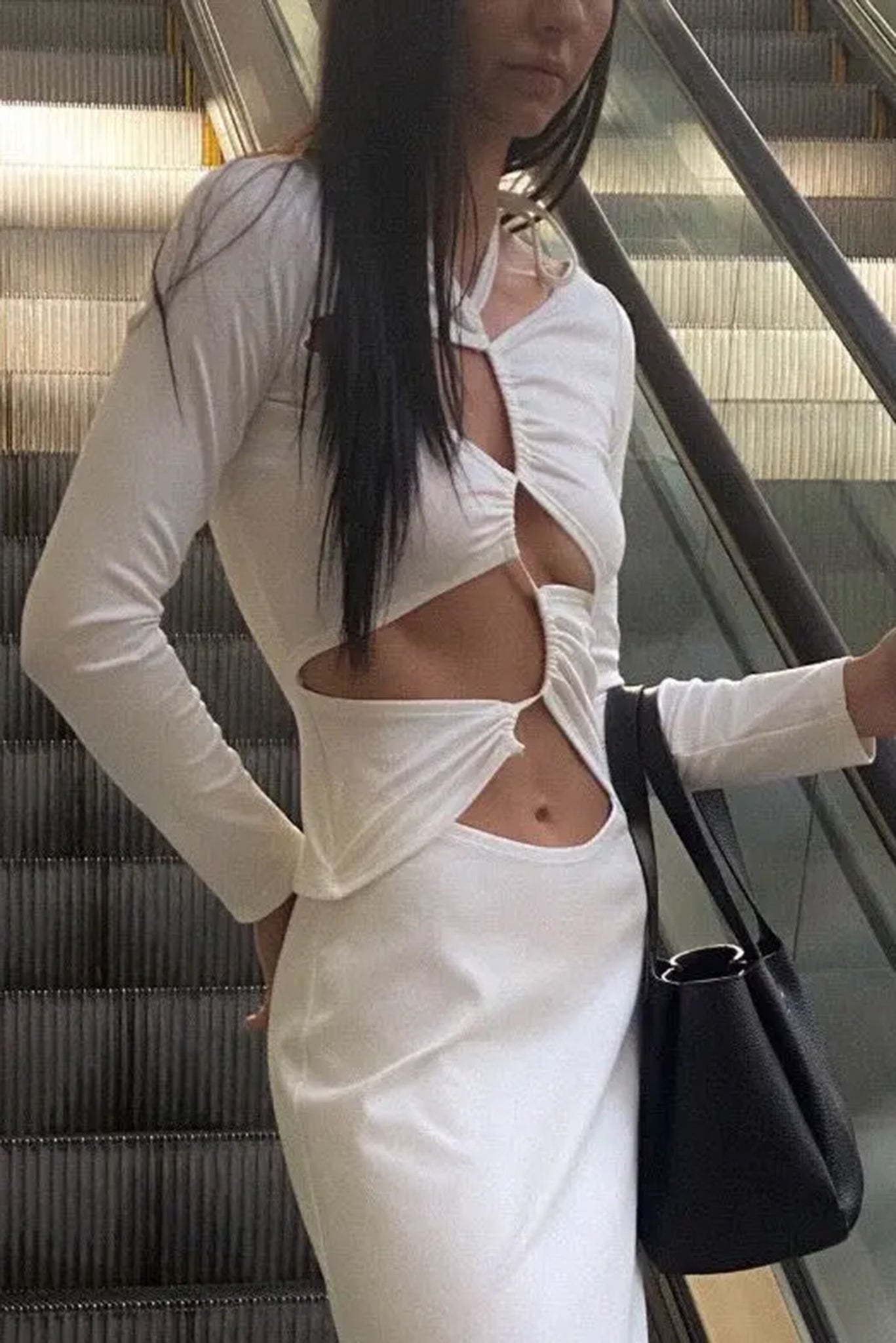 Asymmetrical long sleeve dress in stretch satin fabric. Each panel of the stretch knit was drafted to create tension on the vertical line. The vertical line is a stretch grosgrain ribbon which allows it to conform to the body and gives it versatility by being able to adjust the amount of gathers on the panels and position to support the bust. Concealed side zipper.