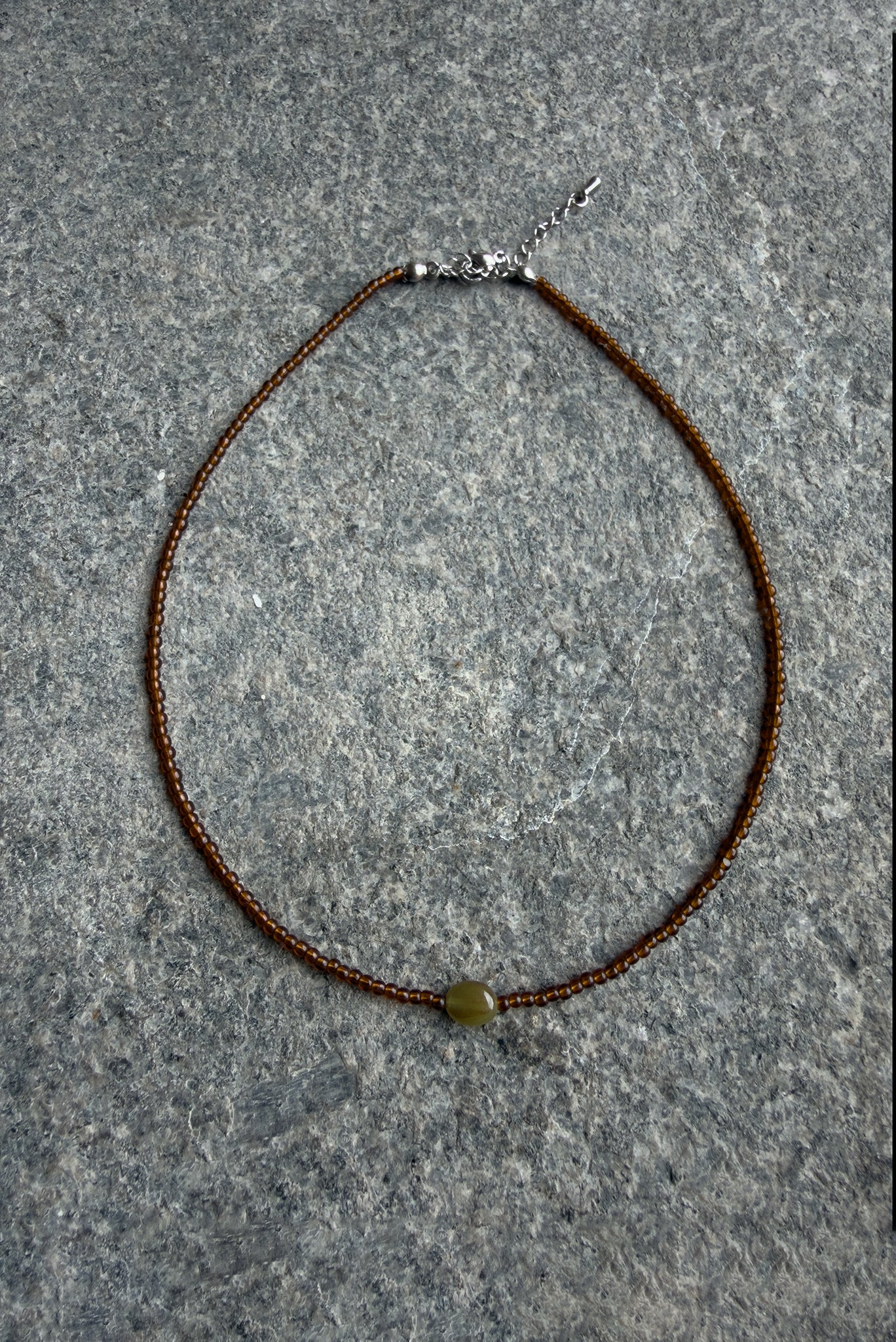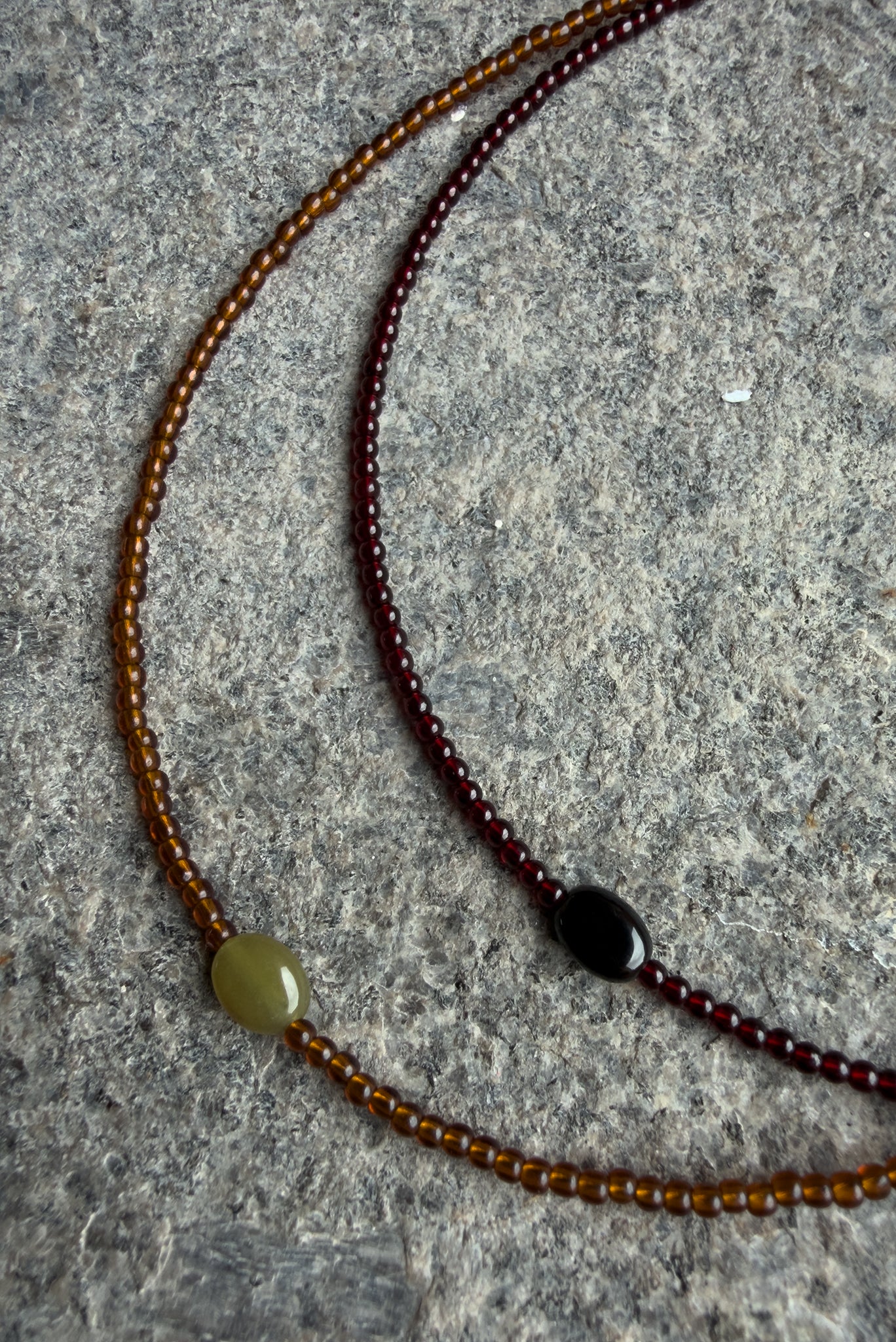 A playful beaded strand in a rich mustard tone. Adds a vivid color pop to pared-back dressing.
