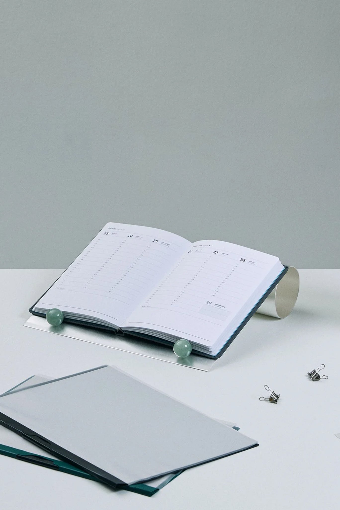 The Natalia Criado iPad Holder crafted from silver plated brass, showcases a graceful, curved silhouette that seamlessly combines form and function. The sleek, rolled base provides stability, while two smooth green quartz accents add a touch of sophistication and subtle contrast. Designed for a modern, minimalist aesthetic, this statement piece elevates your device display with artistic refinement.