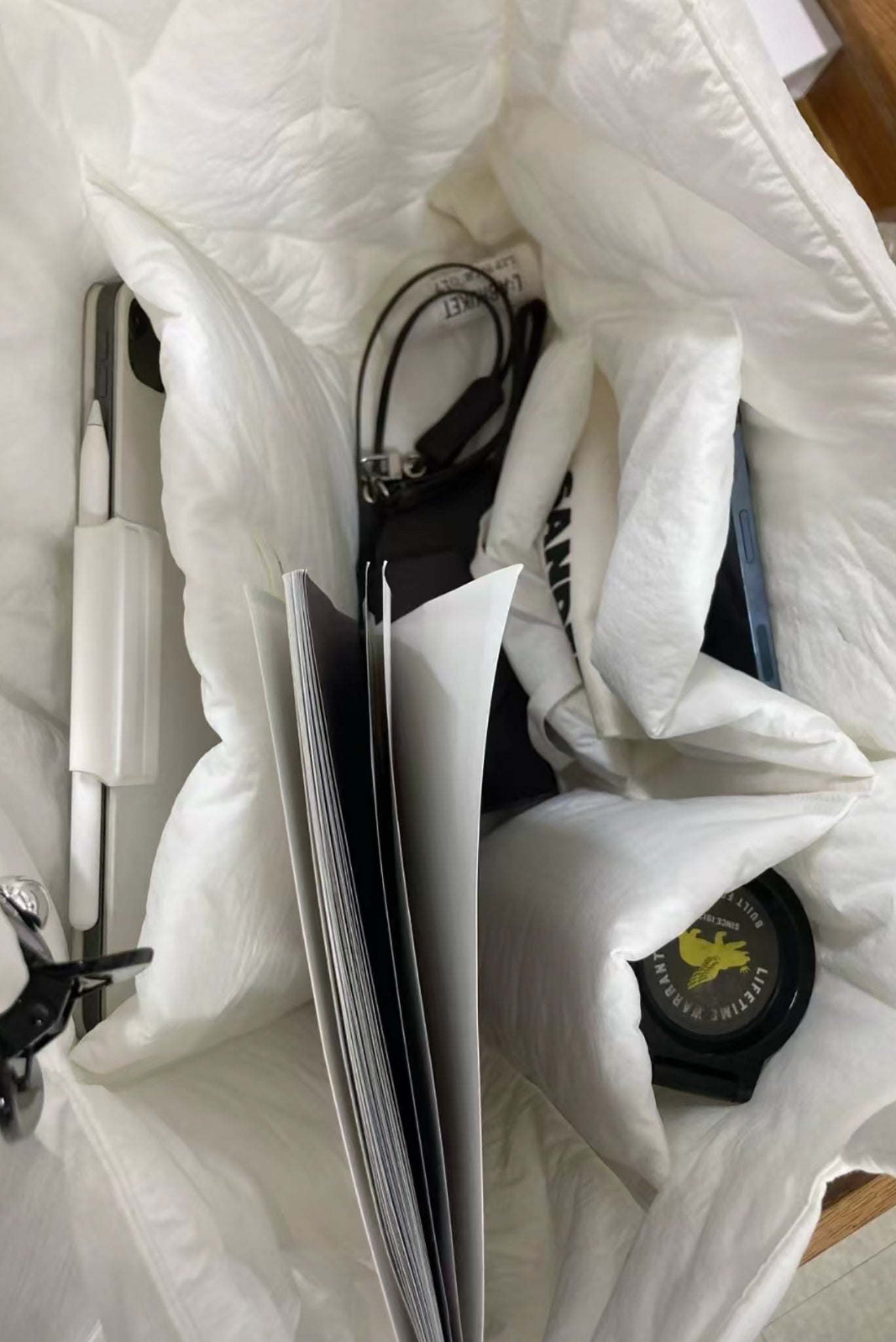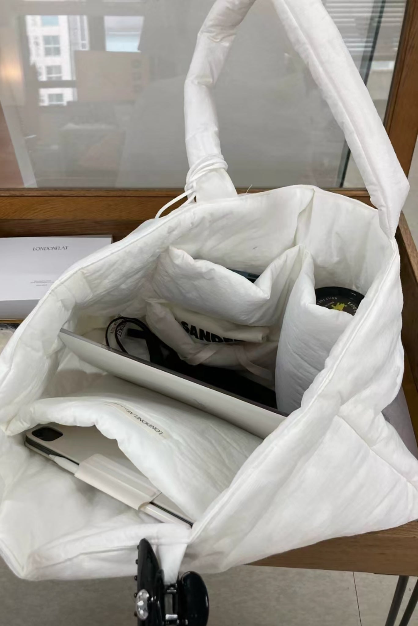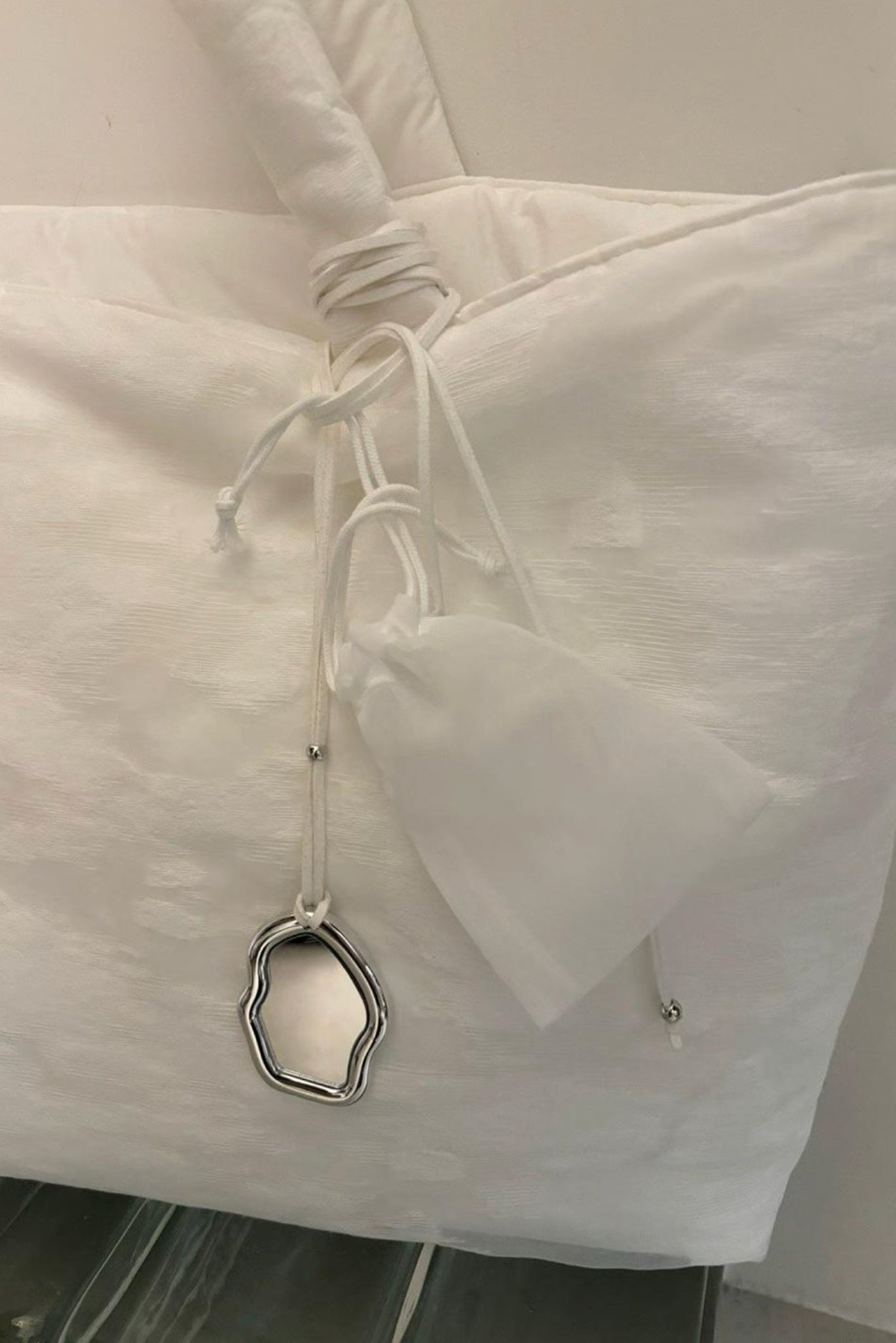 This oversized quilted white bag brings together comfort and contemporary style. Crafted with a soft, padded finish, it’s lightweight yet roomy enough to carry all your essentials. The structured silhouette is accented with a removable mirrored charm and drawstring detail, adding a touch of character to its minimalist design. Features a large inside compartments and pockets for optimal organization.