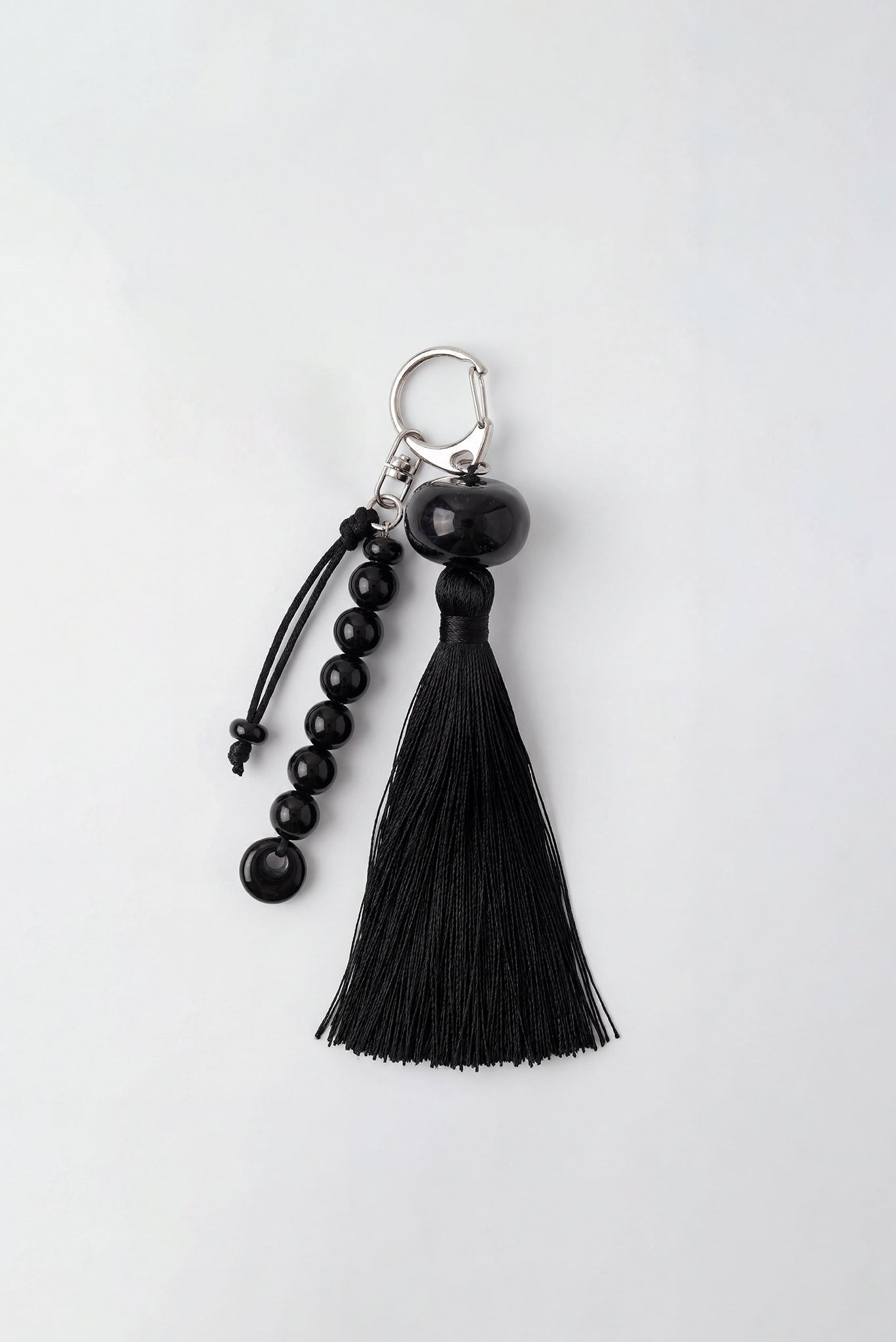 A statement keychain featuring a tassel and bead strand finished with polished hardware. Clip to bags, keys, or belt loops for a subtle, styling-forward accent.