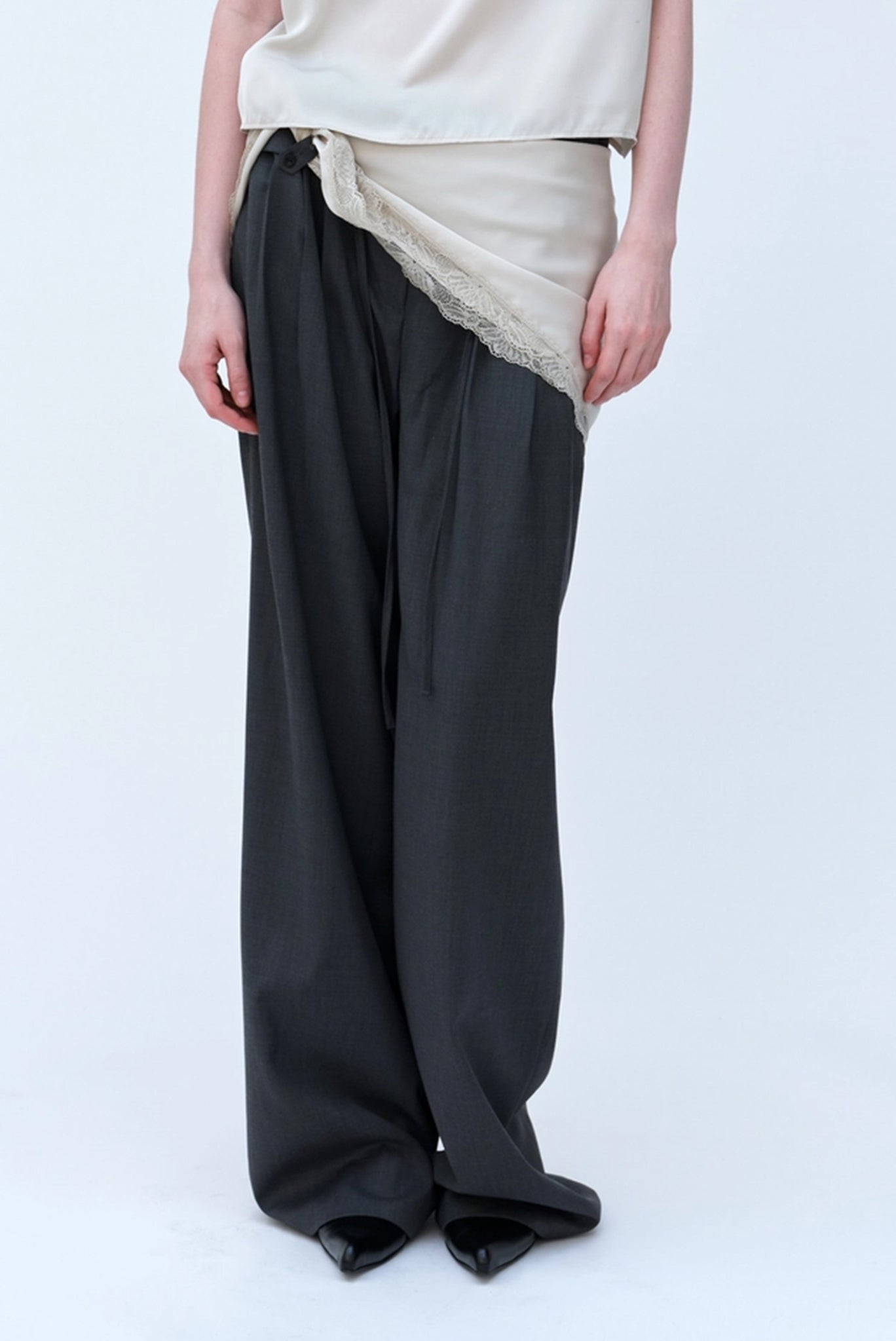 A delicate two-piece set featuring fluid lace-trim shorts with a matching waist scarf. The soft drape and styling-forward scarf detail can be tied, layered, or worn asymmetrically.