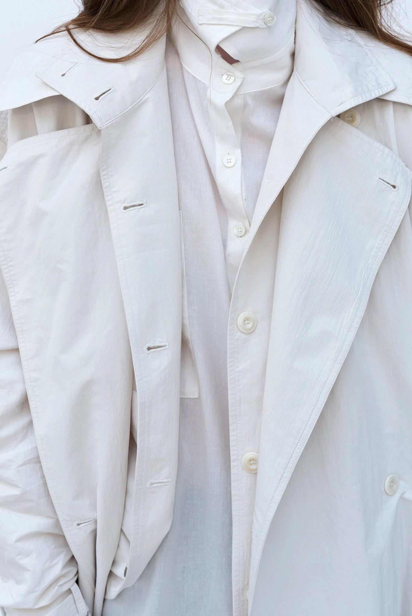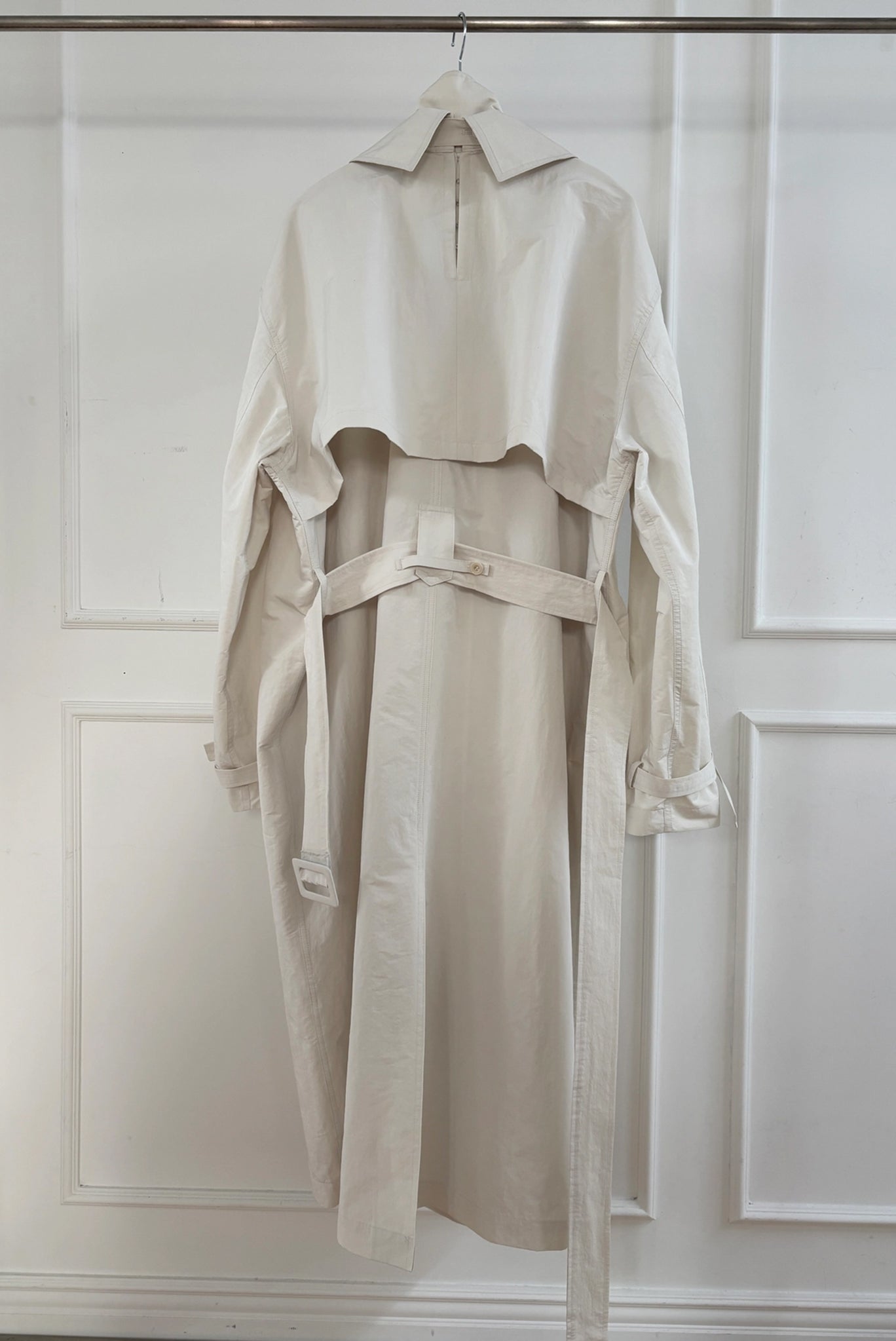 A timeless trench coat in a soft off-white tone with a relaxed, elongated silhouette. Oversized lapels, a back storm flap, and adjustable cuff straps add classic structure with effortless drape.