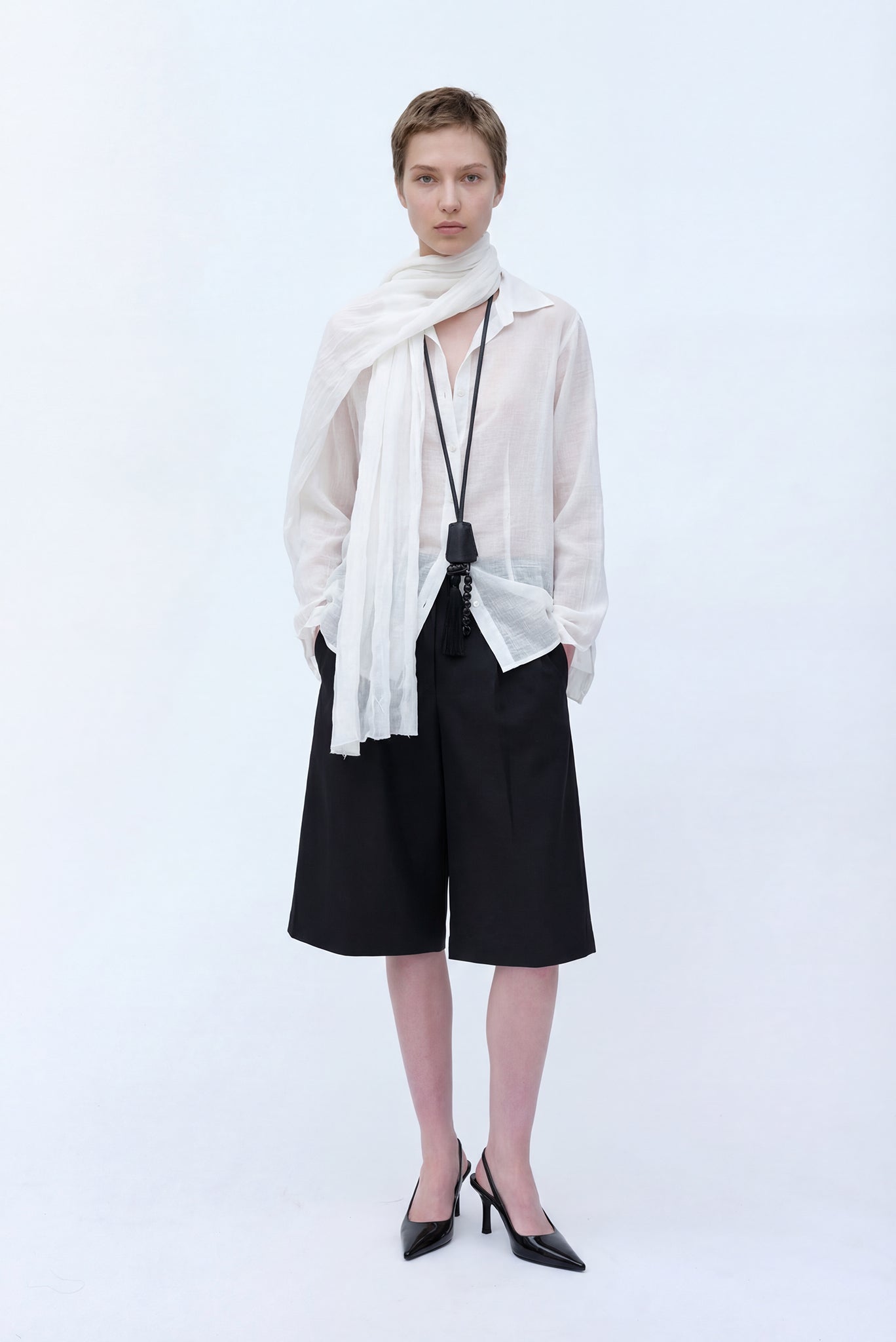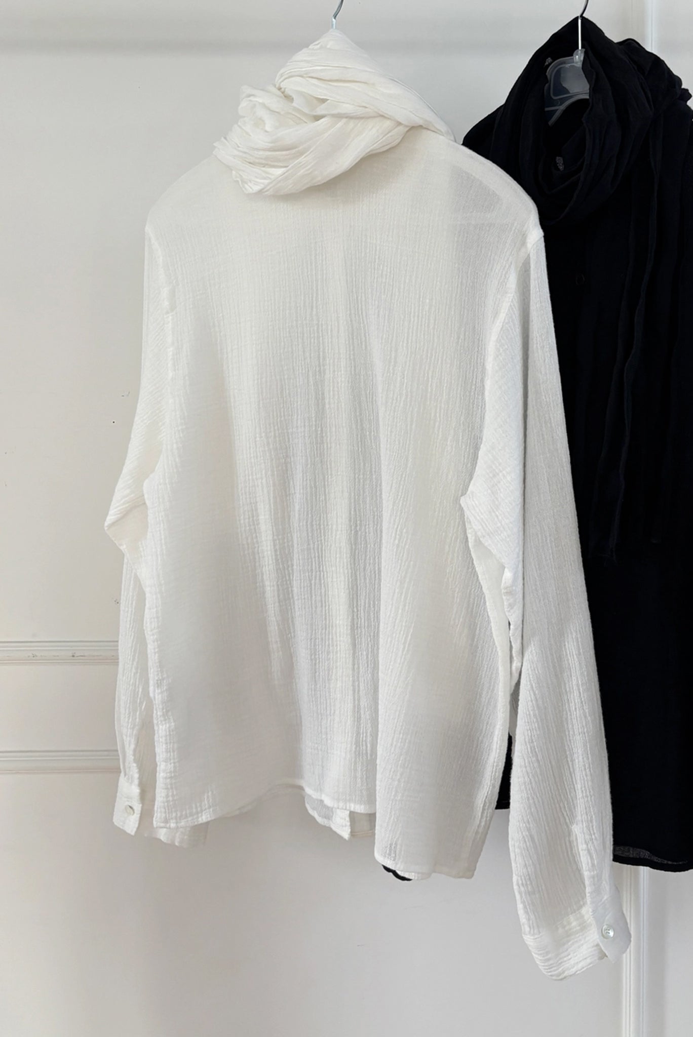 A semi-sheer button-up shirt with an elongated silhouette and detachable scarf detail. Wear the scarf tied, draped, or left loose for understated styling versatility.