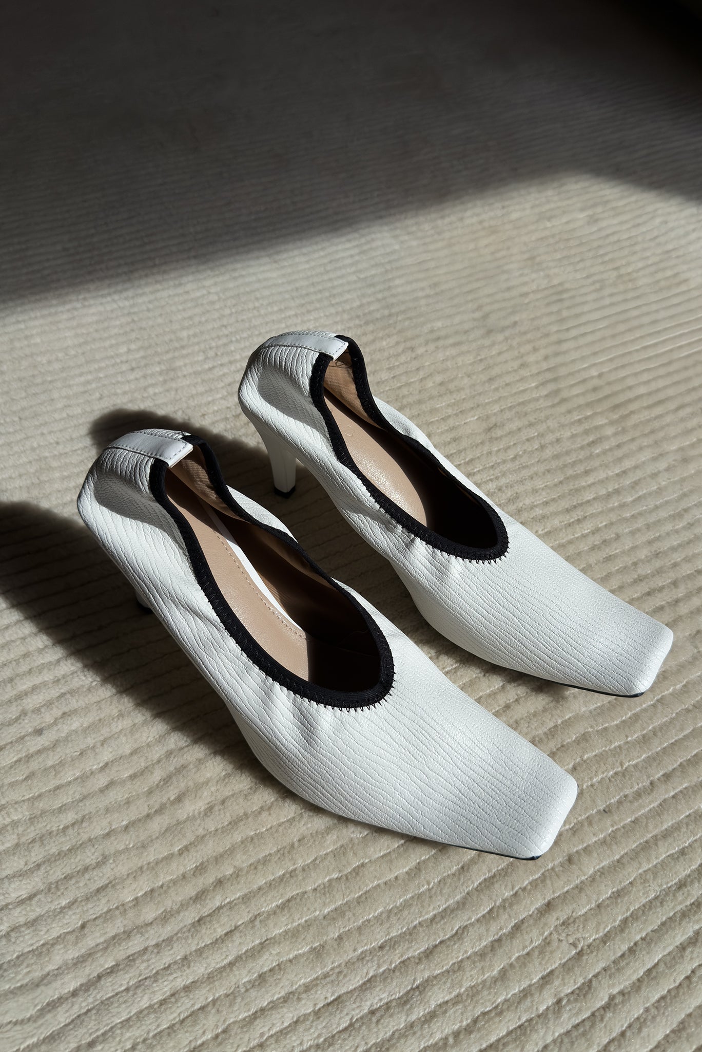 A statement heel with architectural precision. These square-toe pumps feature a sculpted 9cm stiletto heel and a textured upper that molds to the foot like a second skin. Designed with a glove-fit silhouette and an exaggerated square toe for sharp visual impact. Available in bold zebra print, classic black, and minimalist ivory—each pair adds directional refinement.
