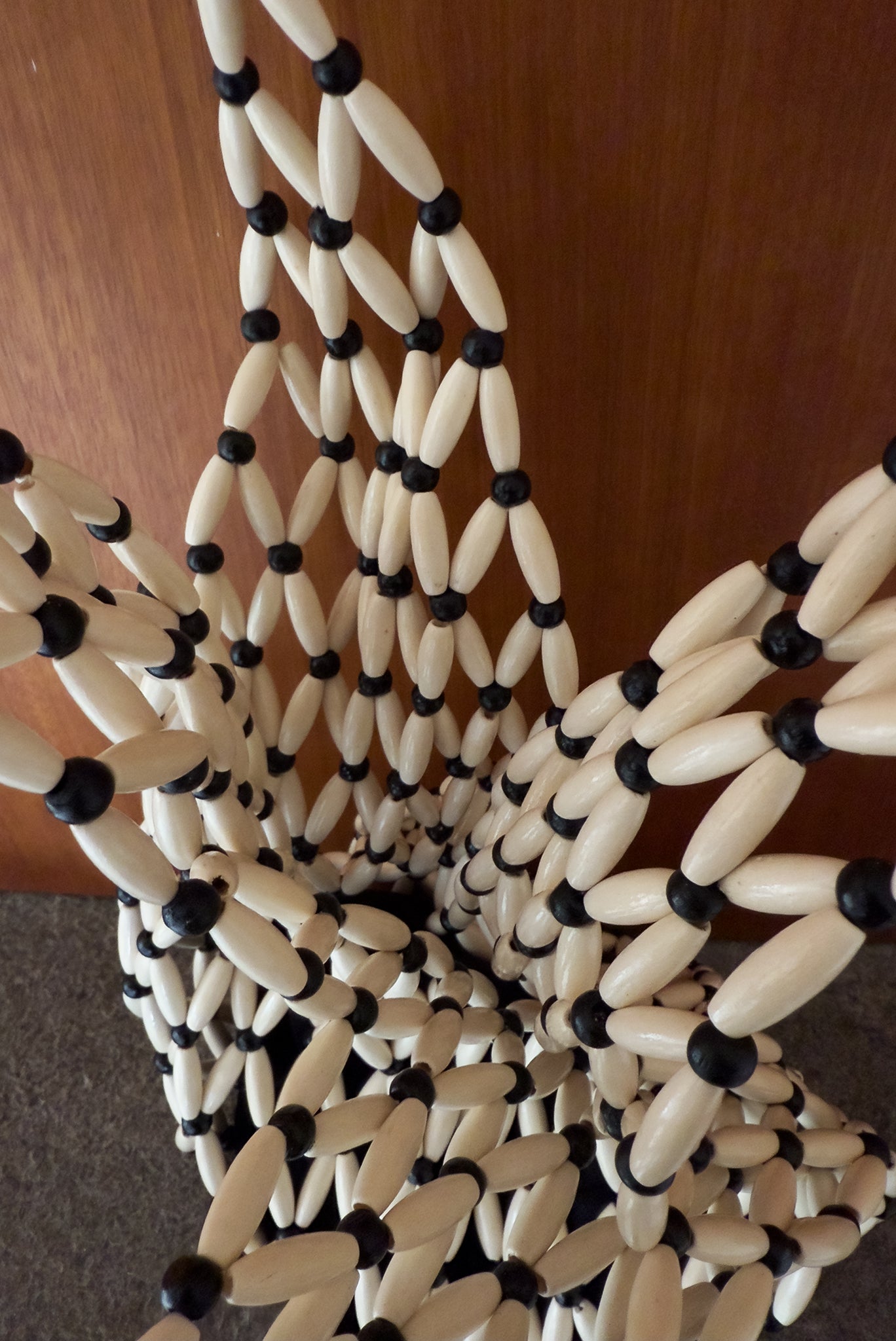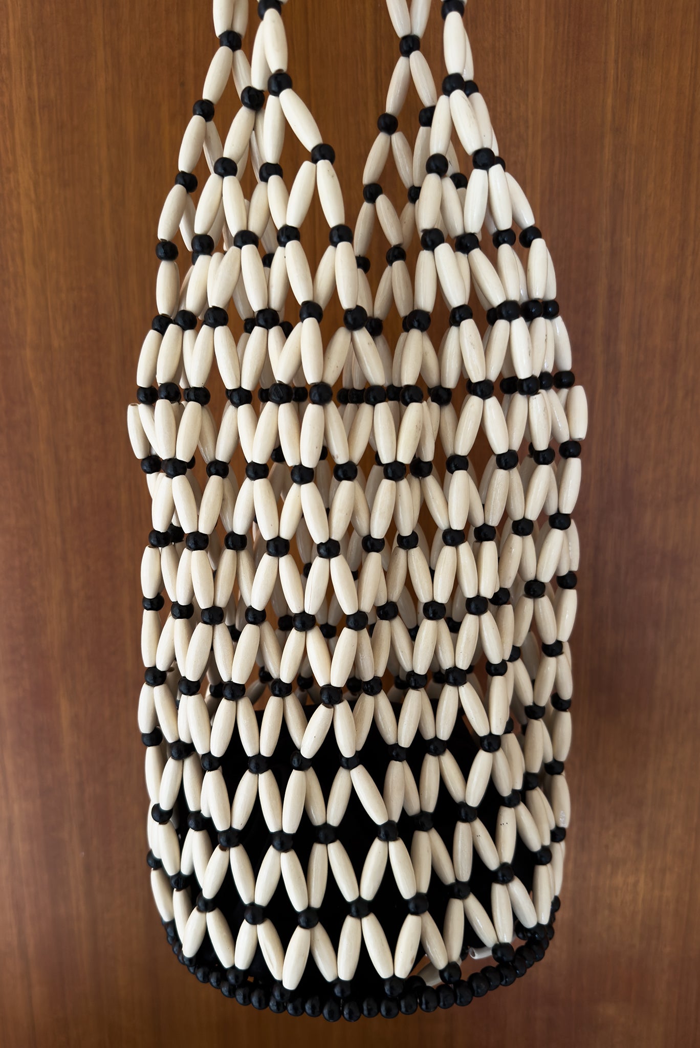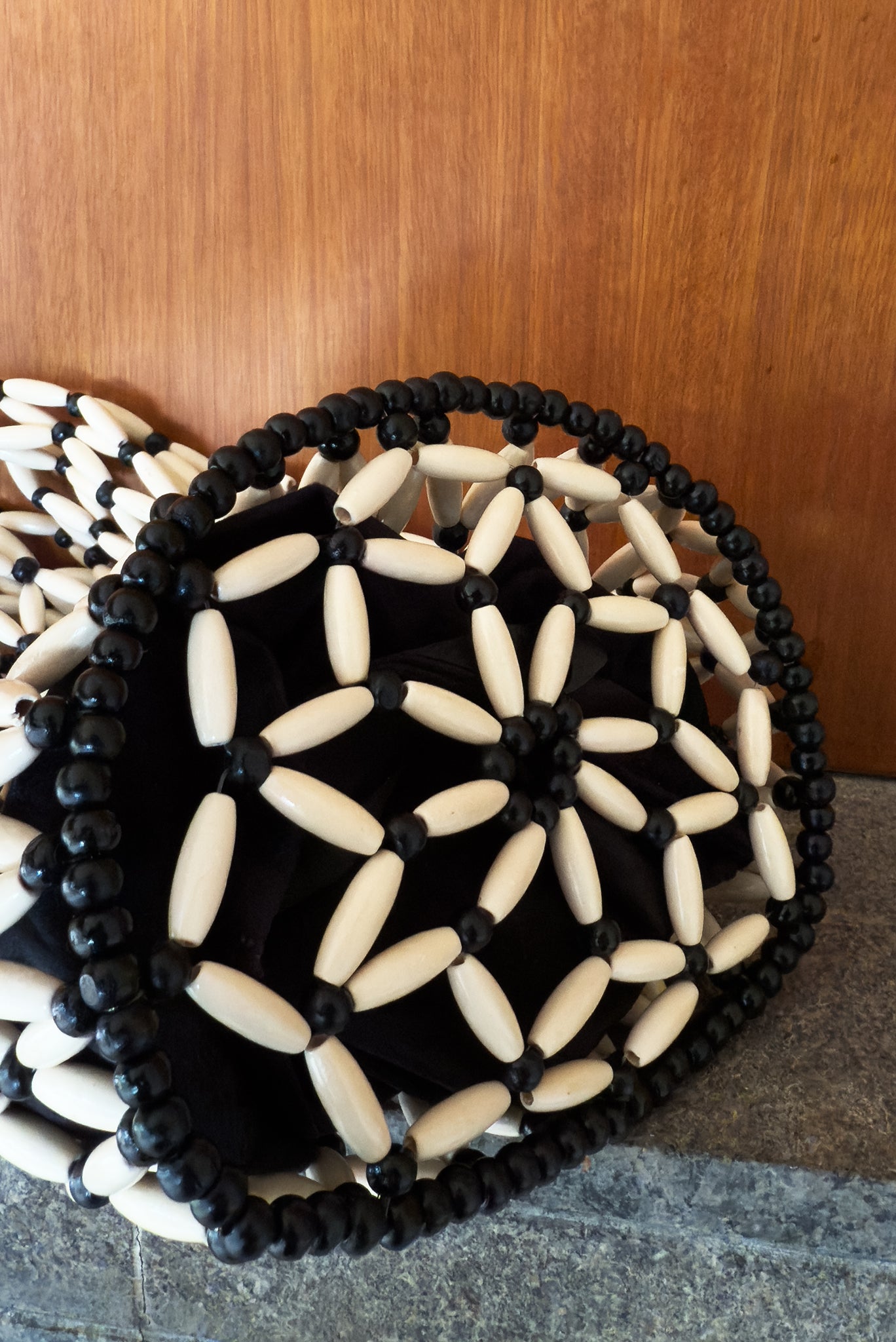 Handwoven from polished oval wooden beads in a neutral bone tone, anchored with glossy black connector beads, the open-lattice design gives it a lightweight yet statement-making look. Its curved silhouette mimics a twisted drop of water, while the dual strap handles allow for handheld or over-the-wrist styling. Material: Wooden Beads Made In: China