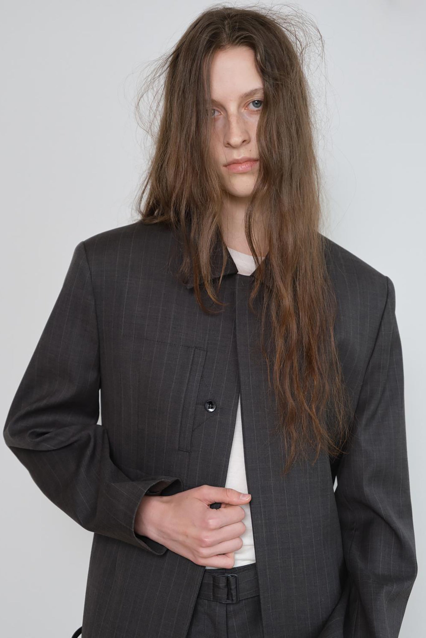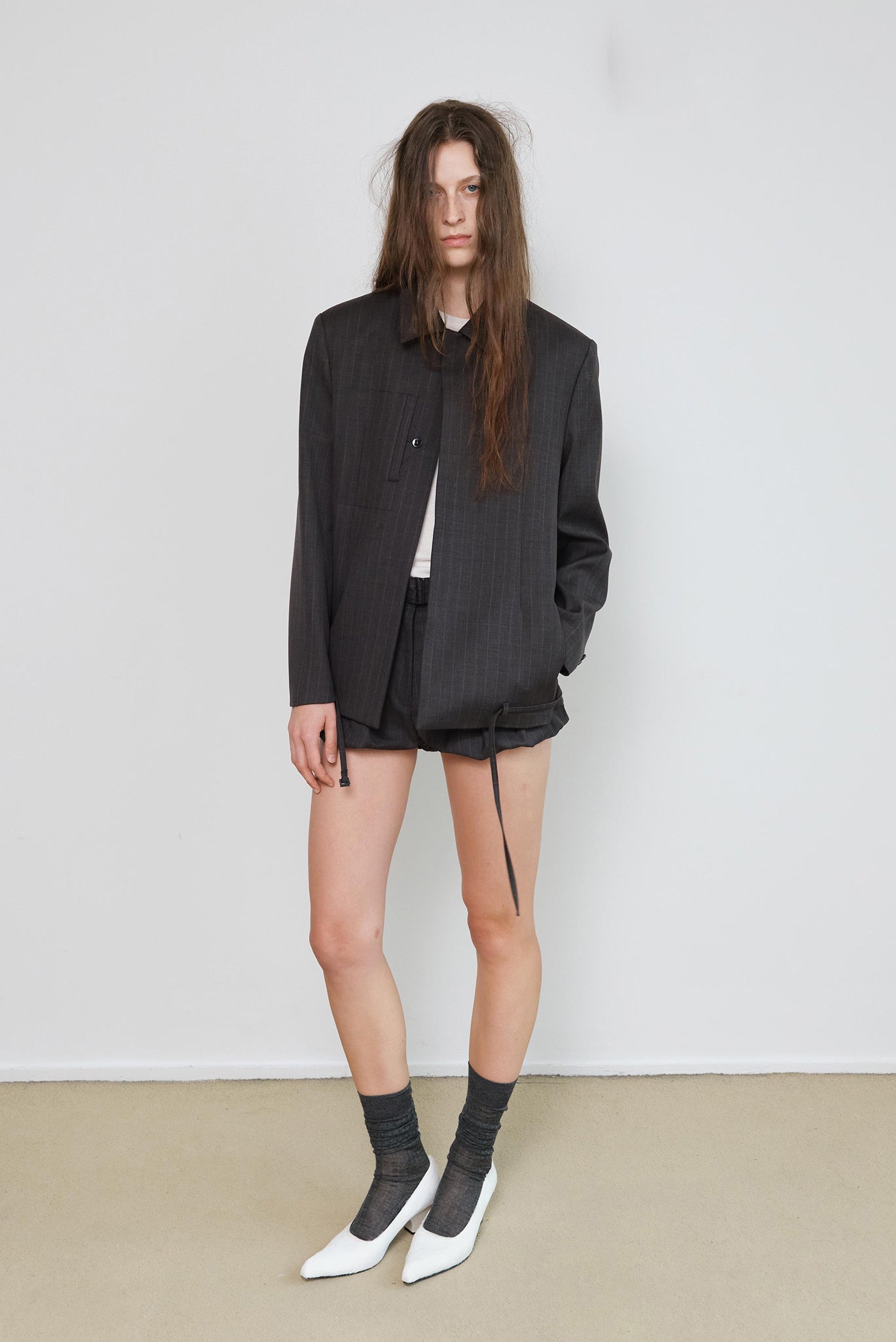 This boxy pinstripe jacket redefines tailoring with a modern, relaxed silhouette. Cut with a slightly cropped length and straight fit, it offers a clean, minimalist take on the classic blazer. Subtle pinstripes add texture without overpowering, while the lightweight structure makes it versatile for layering over everything from crisp shirts to casual knits. Best paired with the matching bubble short as a set.