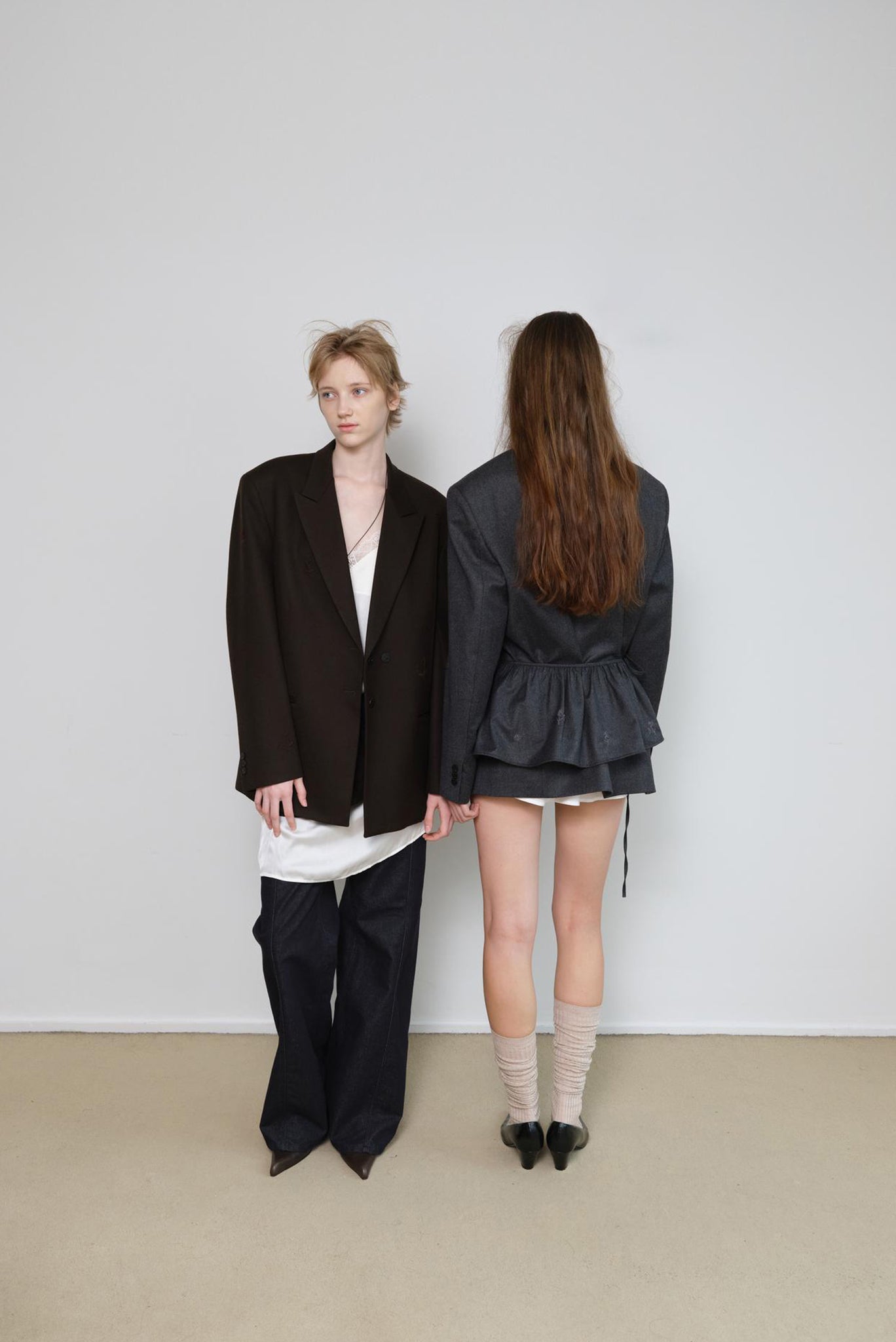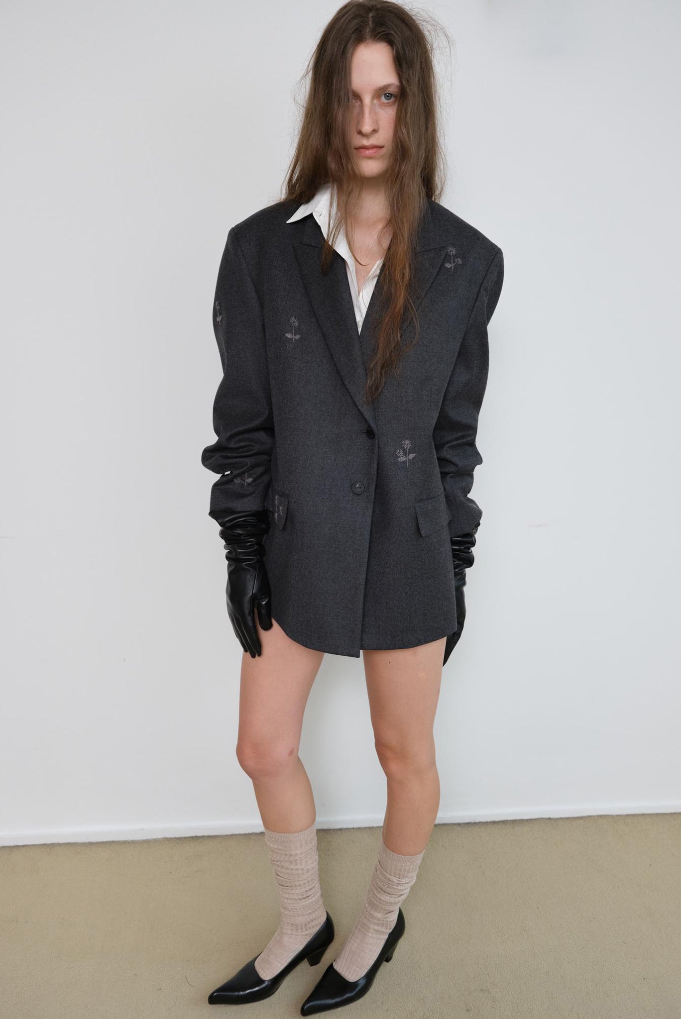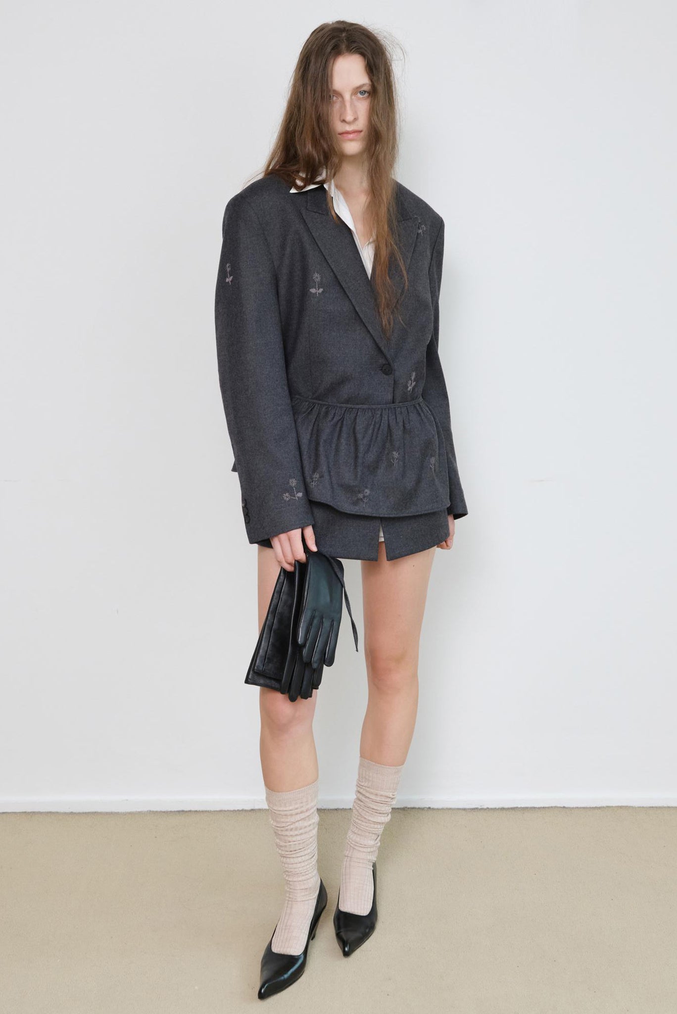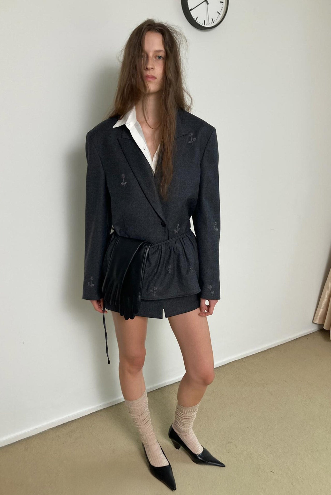 This charcoal embroidered blazer jacket combines tailoring with subtle detailing. Cut in a structured silhouette, it features a cinched waistline (achieved through the ruffle waist strap) that balances sharp shoulders with a feminine shape. The tonal floral embroidered accents add texture and individuality, while the single-breasted closure keeps the look clean and modern.