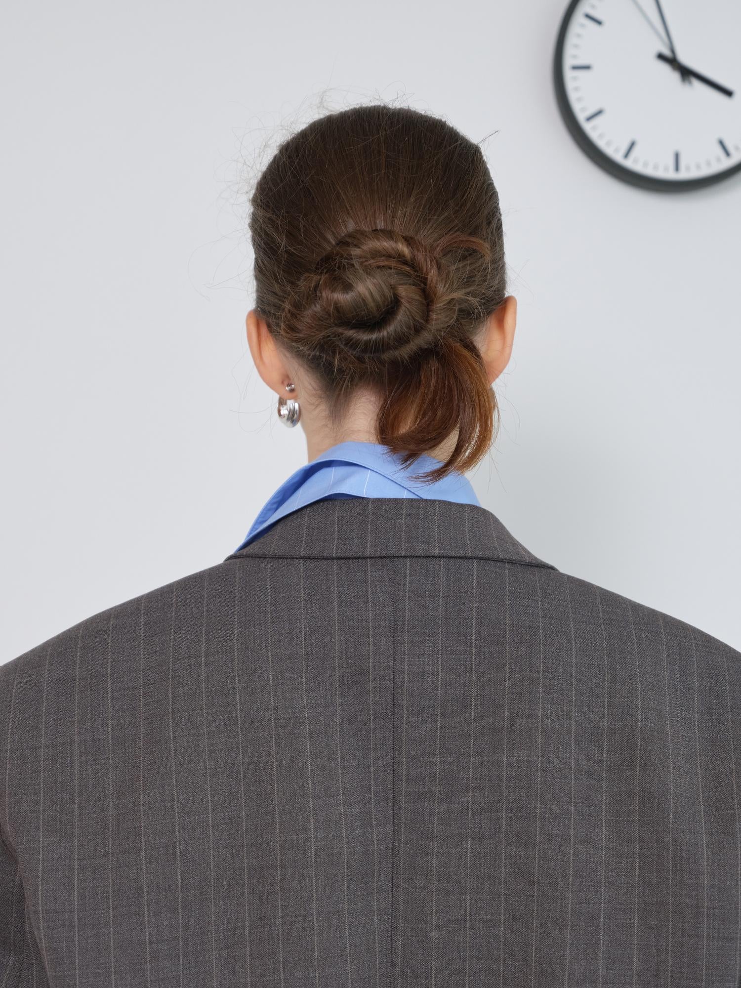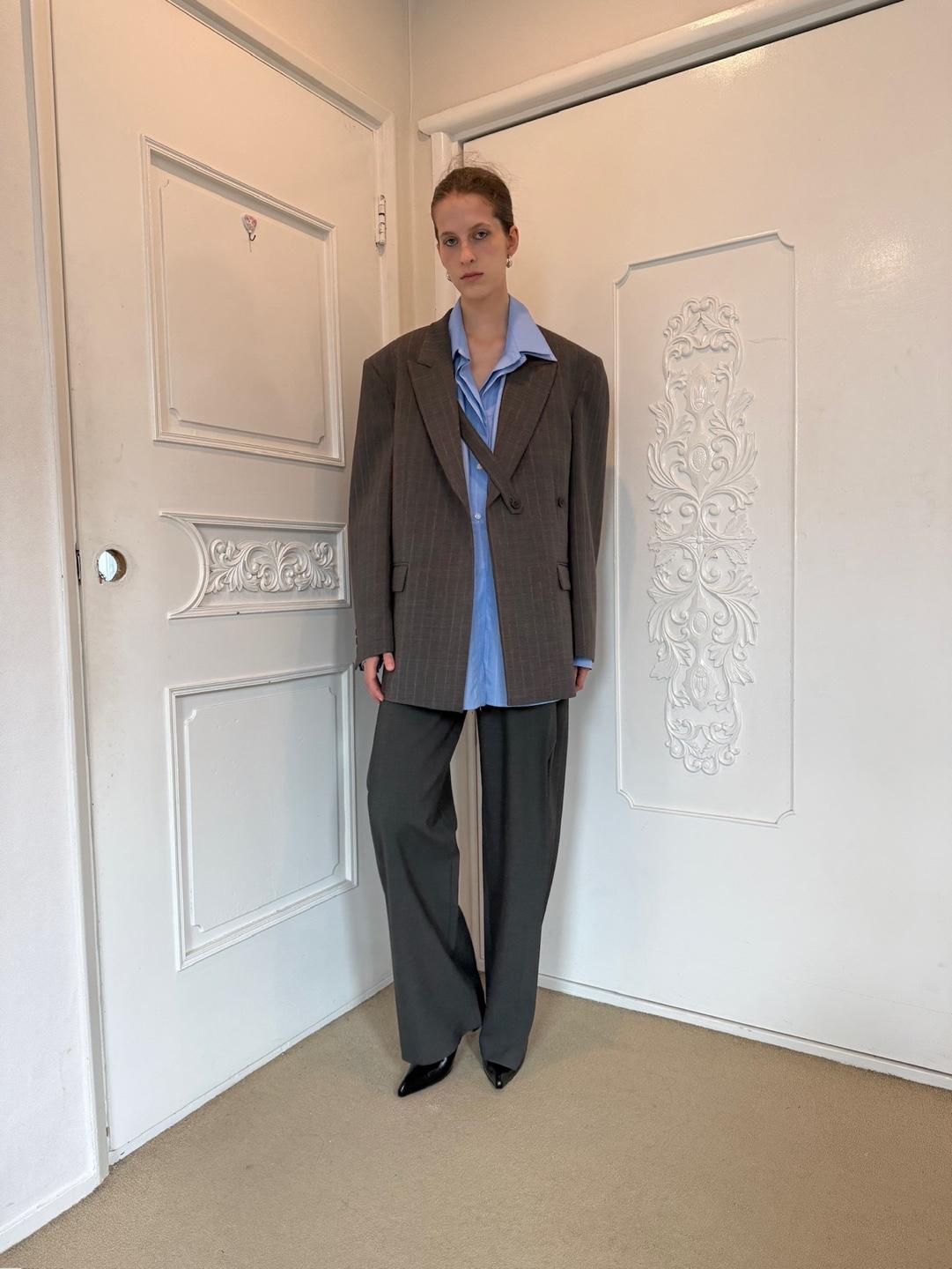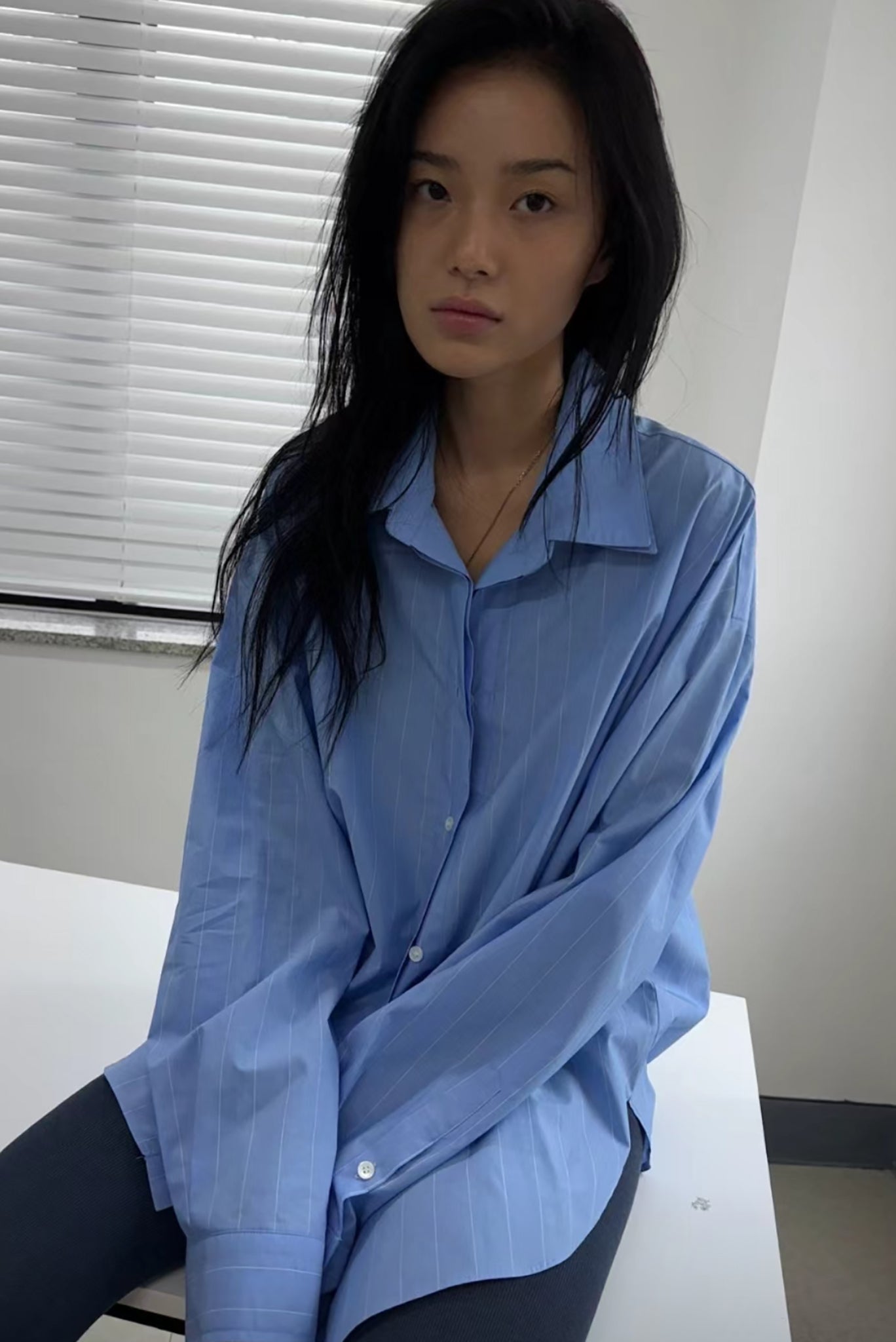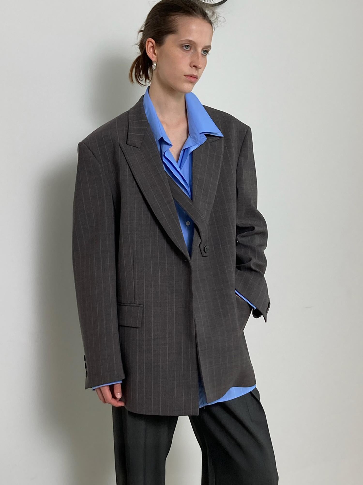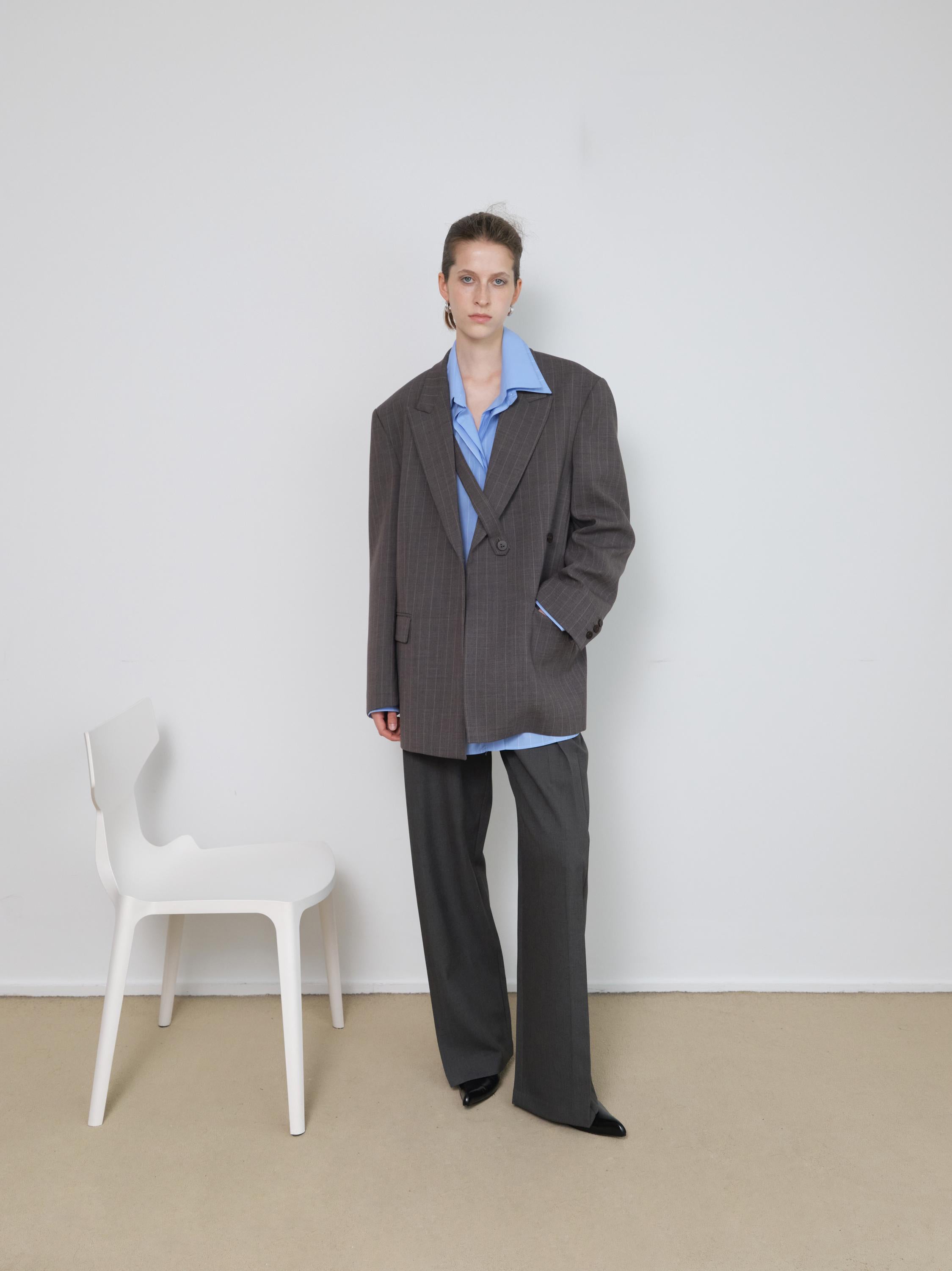 A fresh twist on the classic button-up, this oversized double-collar shirt in light blue pinstripes is all about understated impact. Designed with a layered collar detail, it brings subtle complexity to a timeless silhouette. The relaxed fit and crisp cotton fabric make it versatile enough to wear tucked into tailored trousers, layered under outerwear, or styled loose for effortless ease.