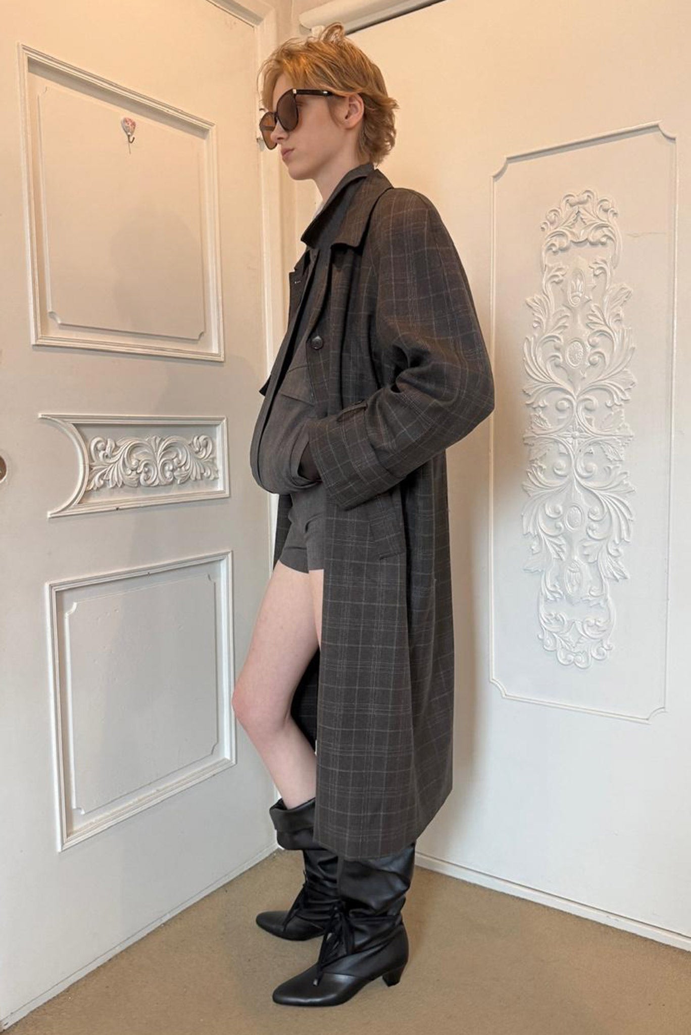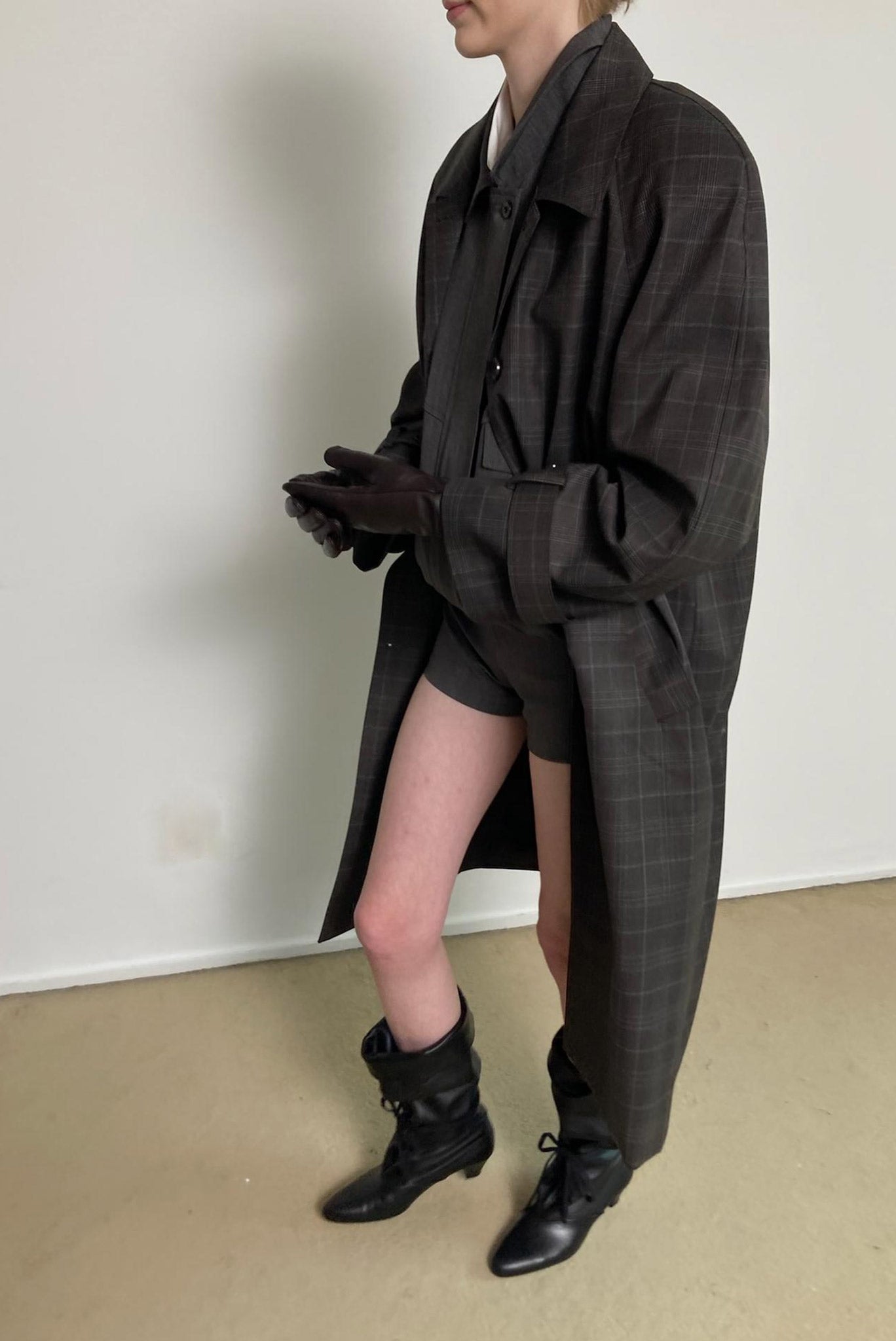 A timeless silhouette reimagined with a modern edge, this oversized plaid trench coat is cut in a relaxed longline shape for effortless layering. The muted charcoal check pattern adds subtle texture, while classic tailoring details—pointed collar, button closure, and deep pockets—keep it grounded in utility. Designed to be both versatile and directional, it pairs easily with sharp tailoring or casual essentials.