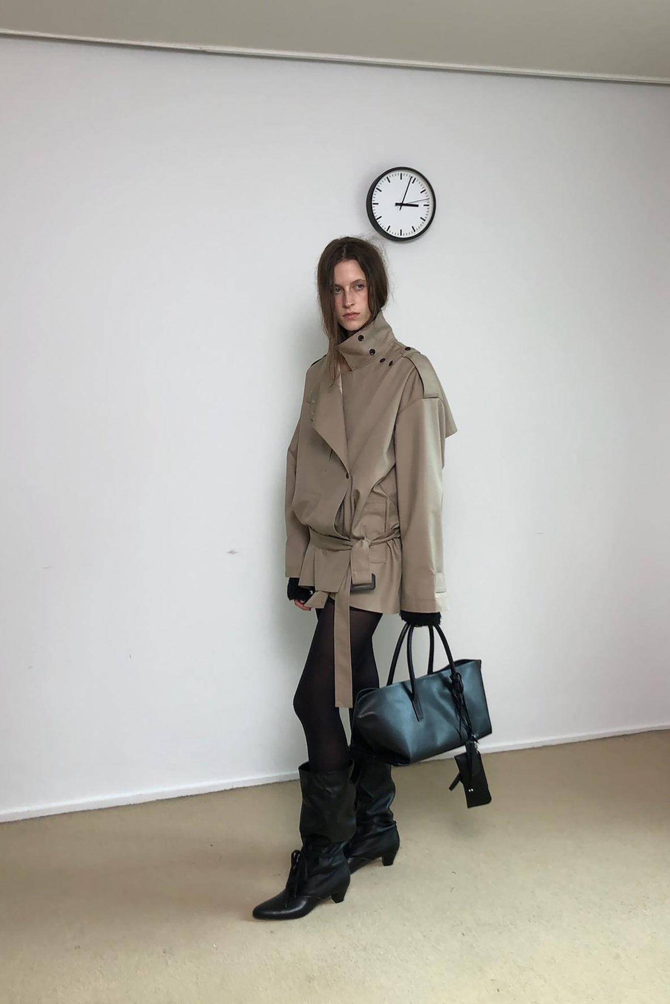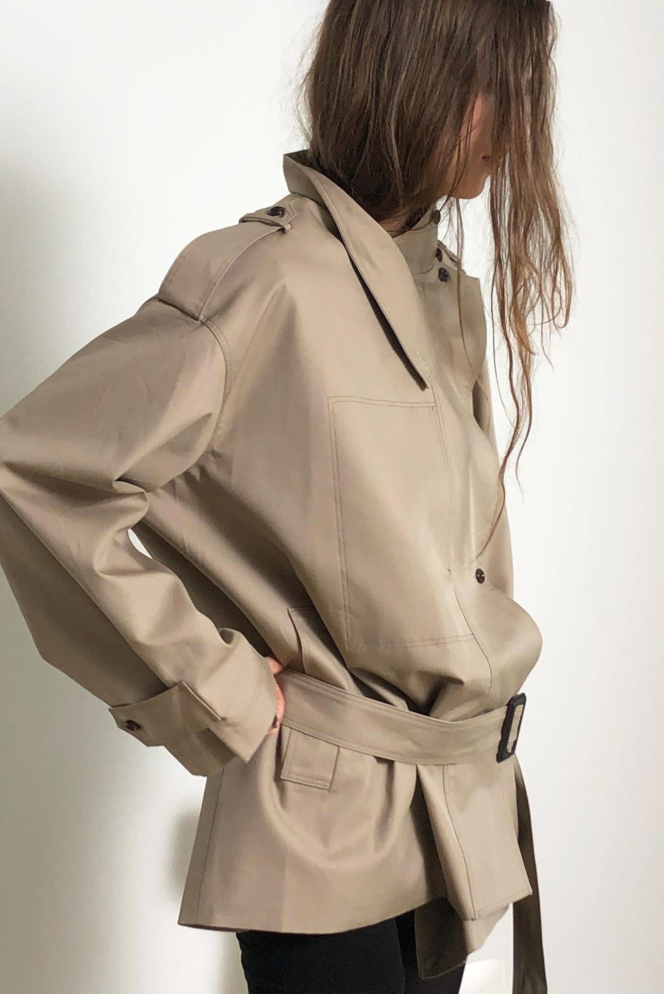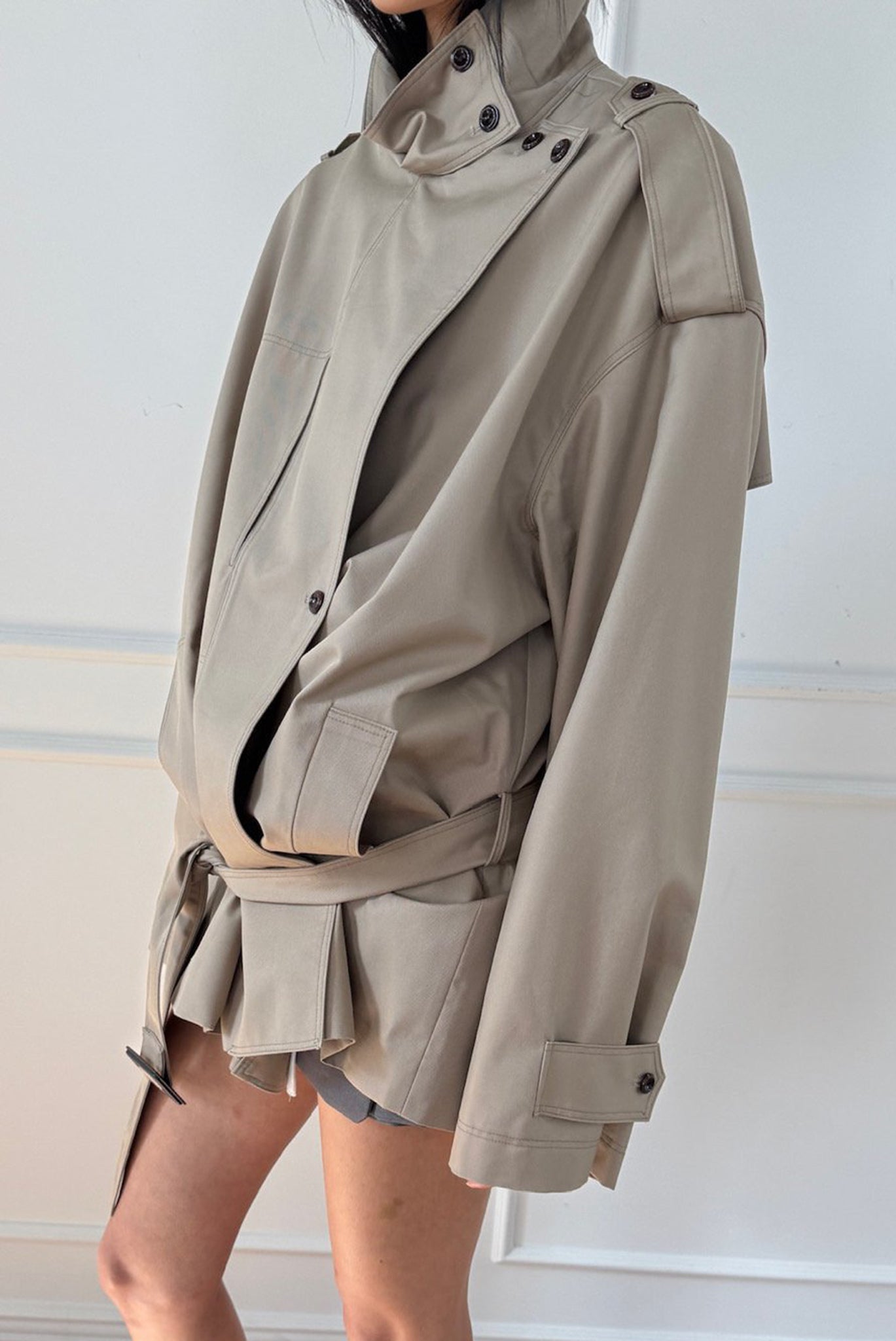 A directional update to the trench silhouette, this asymmetrical belted trench jacket is designed with an oversized fit and sharp utility details. Cut in a soft khaki tone, it features a high buttoned collar, shoulder epaulets, and a statement asymmetrical front with an elongated belt for versatile styling. The lightweight yet structured design makes it a transitional piece for layering across seasons. Best worn bare leg for a mini effect or with a slim trouser.