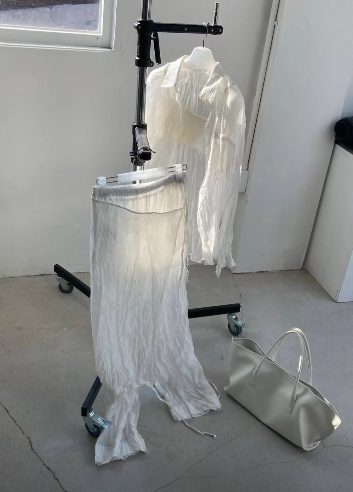 Crinkle texture semi-sheer trouser with elastic waist and a skirt overlay that ties at the waist and hem.
