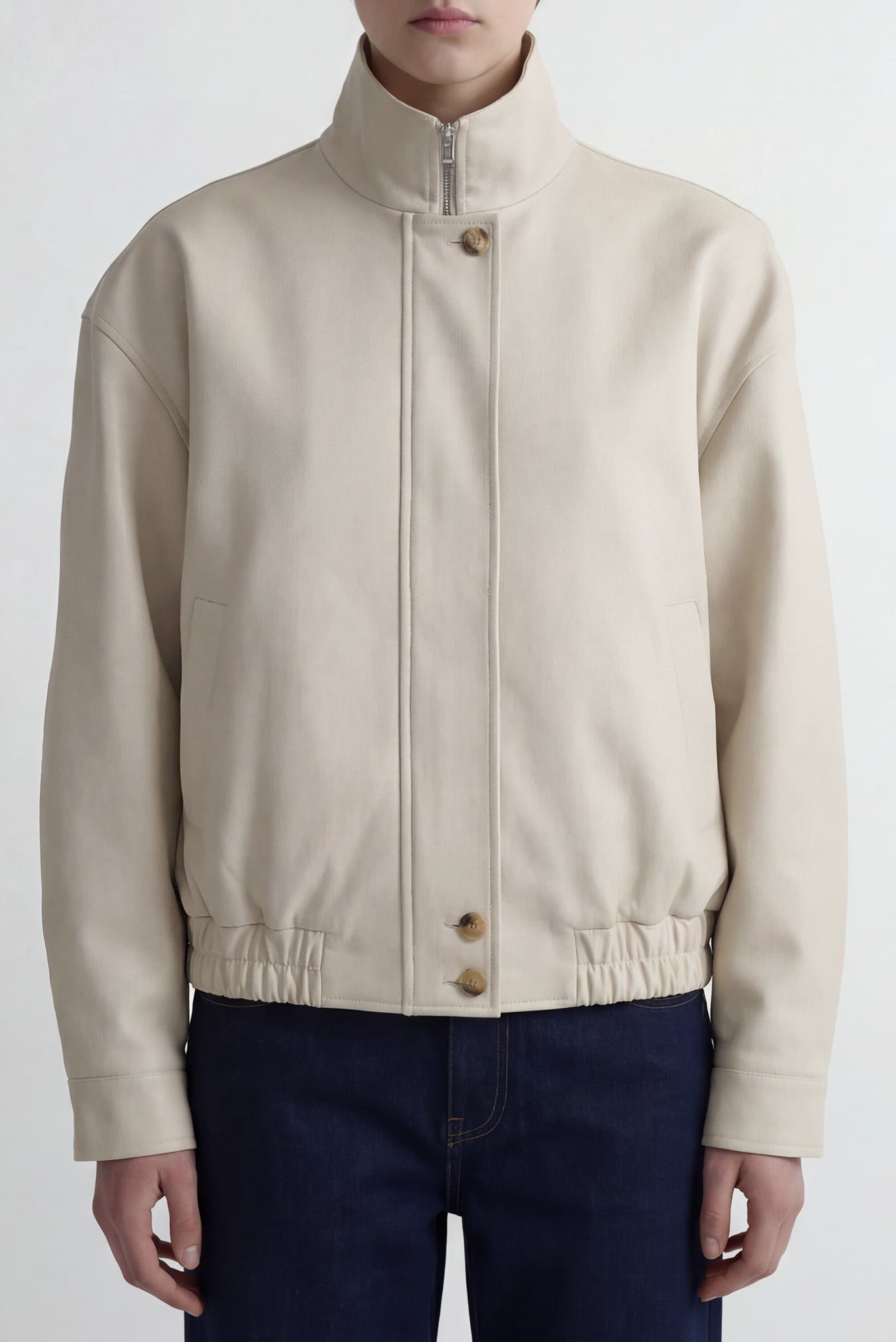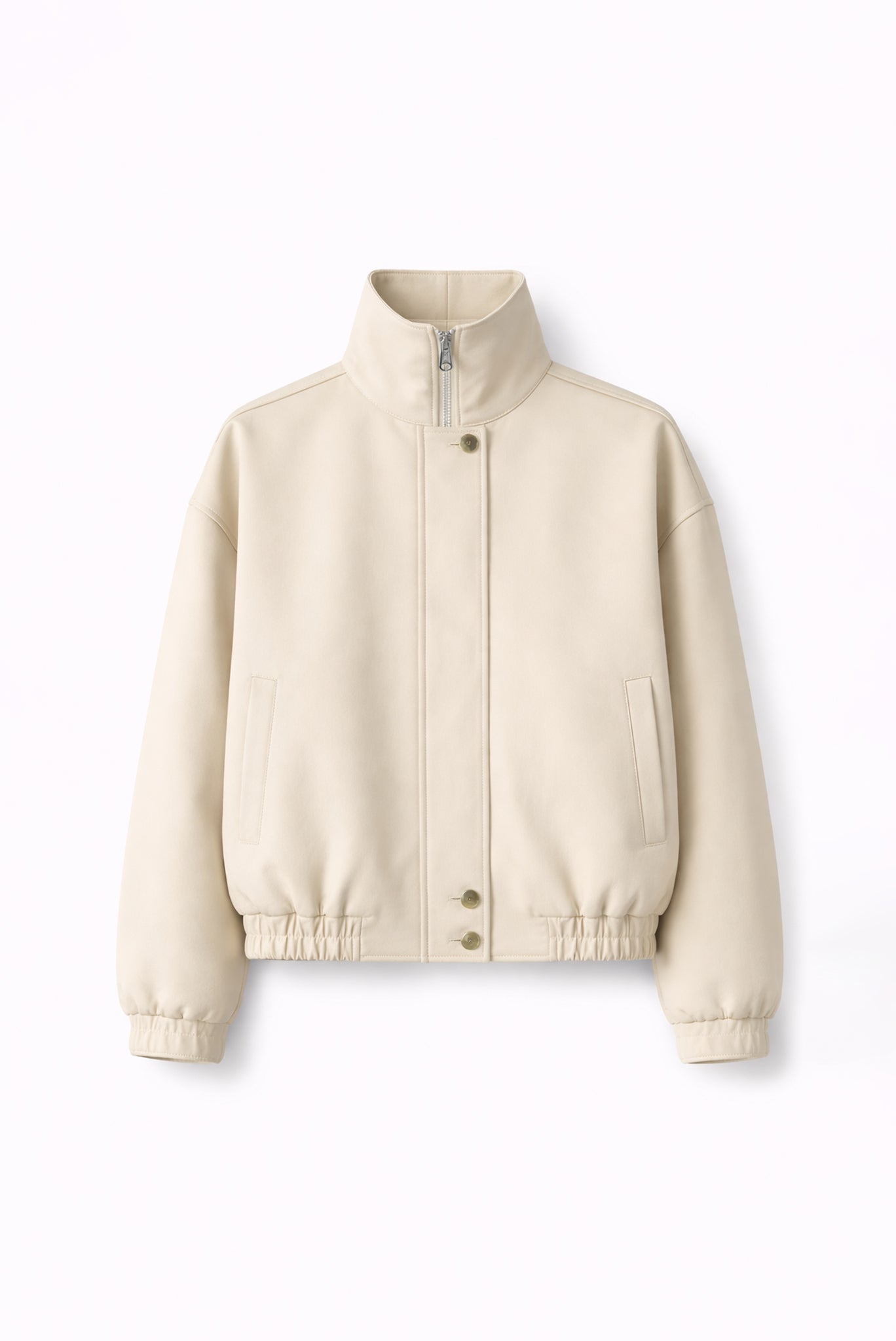 Lightweight cream jacket crafted from smooth, structured fabric with a soft matte finish. Designed with a clean high-collar neckline and a concealed front closure featuring a short zipper and button fastening. Cut with a relaxed, slightly boxy silhouette, finished with elasticated cuffs and hem for subtle volume. Minimal seam detailing throughout keeps the focus on the streamlined construction and understated tone, making it an easy layering piece for everyday wear.